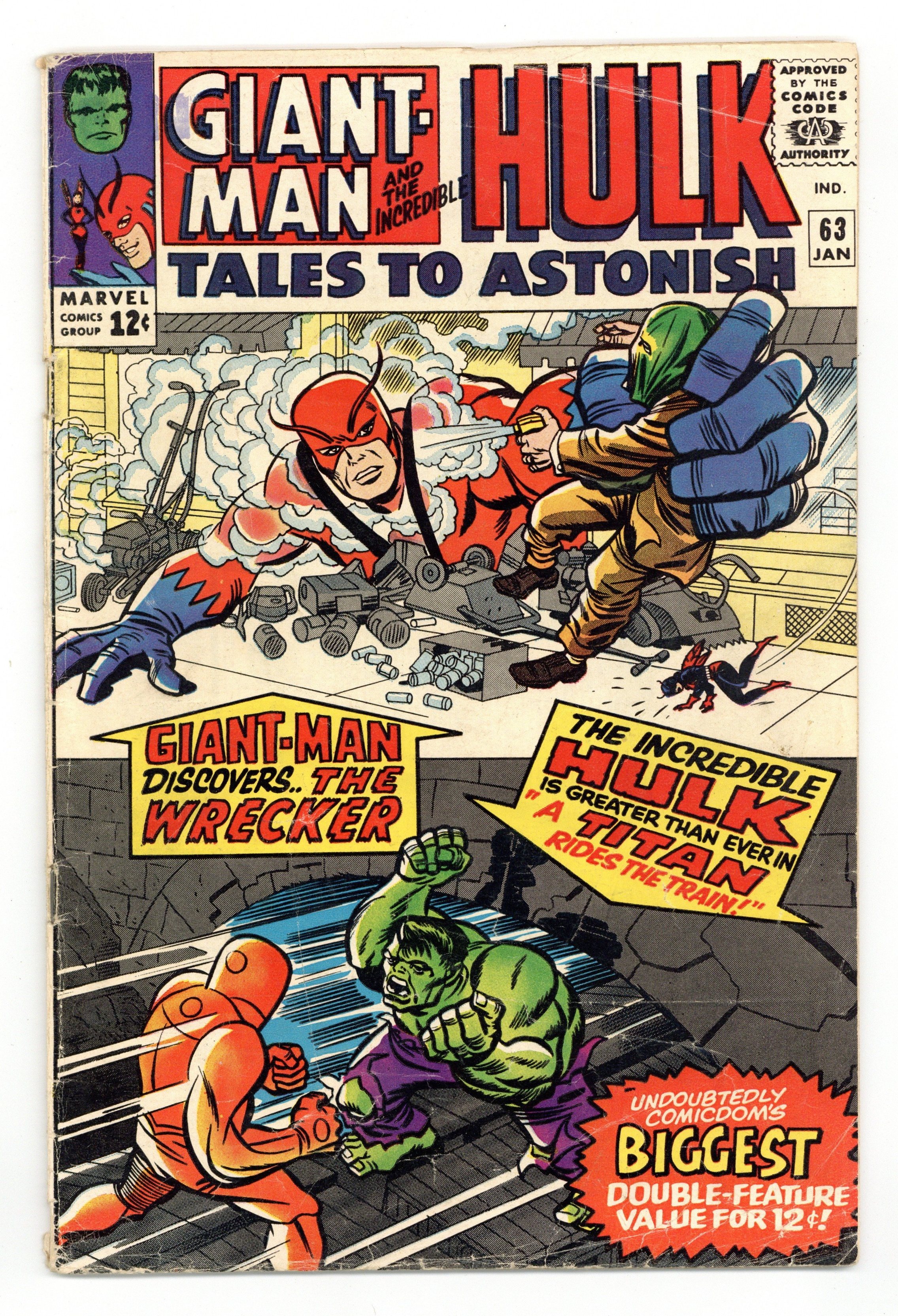 Cover by Jack Kirby and Chic Stone. The Gangsters and the Giant!, script by Stan Lee, art by Carl Burgos and Chic Stone; The police ask Giant-Man and the Wasp to stop the Wrecker and his gang who have been strong-arming business owners in Brooklyn. A Marvel Masterwork Pin-Up of Giant-Man and Wasp, art by Jack Kirby and Chic Stone. A Titan Rides the Train!, script by Stan Lee, art by Steve Ditko and George Roussos (as George Bell); The Leader ponders his origins as he prepares to send his powerful Humanoid to confront the Hulk; Although he is under suspicion for being in collusin with the Hulk, Banner is sent by train to escort one of his nuclear devices with Talbot keeping a close eye on him. 36 pgs., full color. $0.12. Cover price $0.12.