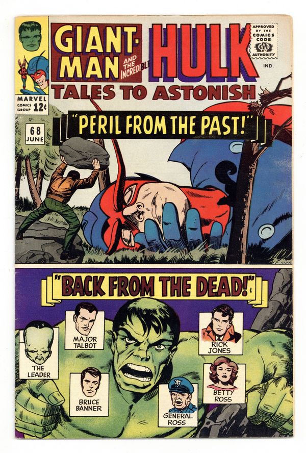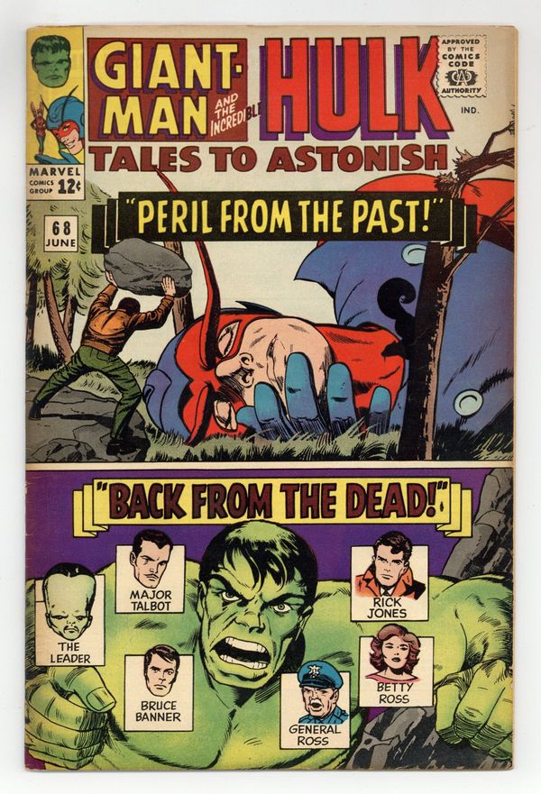 Cover by Jack Kirby, Bob Powell, and Vince Colletta. Peril From the Long-Dead Past!, script by Stan Lee, art by Bob Powell and Vince Colletta; Realizing that the strain of growing and shrinking so much is doing damage to his body, Hank adjusts his helmet so he can only grow to one size--the 35 foot height of Giant-Man; With the Ant-Man side of his abilities out of his bag of tricks, he adjusts Jan's helmet so she can cybernetically communicate with wasps; Oh, and the Human Top attacks too. Back from the Dead!, script by Stan Lee, art by Jack Kirby and Mike Esposito (as Mickey Demeo); Saving Talbot and himself from plunging to their deaths, the Hulk decides he is tired of world travel and leaps home; Waking up in gamma base, Bruce is once again jailed as a traitor and the President once again sets him free (Rick told the commander in chief the secret of the Hulk a few issues ago); Banner and Talbot are once again sent to Astra Island to continue a test of the absorbatron but the leader sends an army of Humanoids who finally succeed in capturing the Hulk. 36 pgs., full color. $0.12. Cover price $0.12.