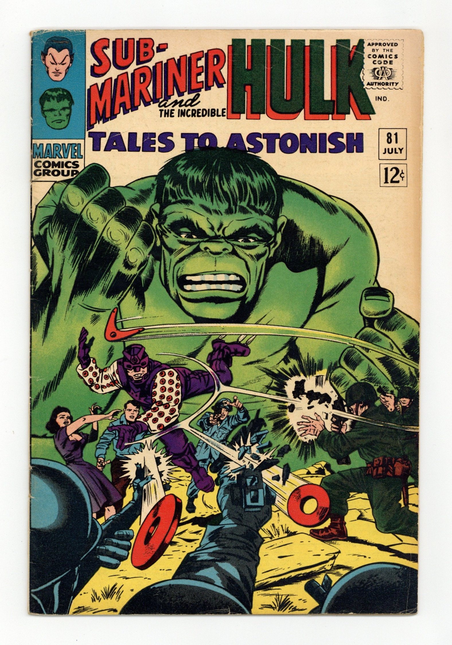 Cover by Jack Kirby and Bill Everett. When a Monarch Goes Mad!, script by Stan Lee, art by Gene Colan and Dick Ayers; Namor is driven mad by the betrayal of Lady Dorma (she agreed to marry Krang last ish in order to protect the Sub-Mariner from the monstrous Behemoth); Dorma and Krang turn their skin to flesh color and head to the surface world to hide out. The Stage Is Set!, script by Stan Lee, art by Jack Kirby and Bill Everett; The Secret Empire hires Boomerang to obtain the plans for the Orion missile and the new bad guy on the block heads for gamma base; As Rick, Betty and Glenn are returned to the surface from the underground subterranean kingdom, Boomerang captures Betty to use as a bargaining chip for the missile. 36 pgs., full color. $0.12. Cover price $0.12.