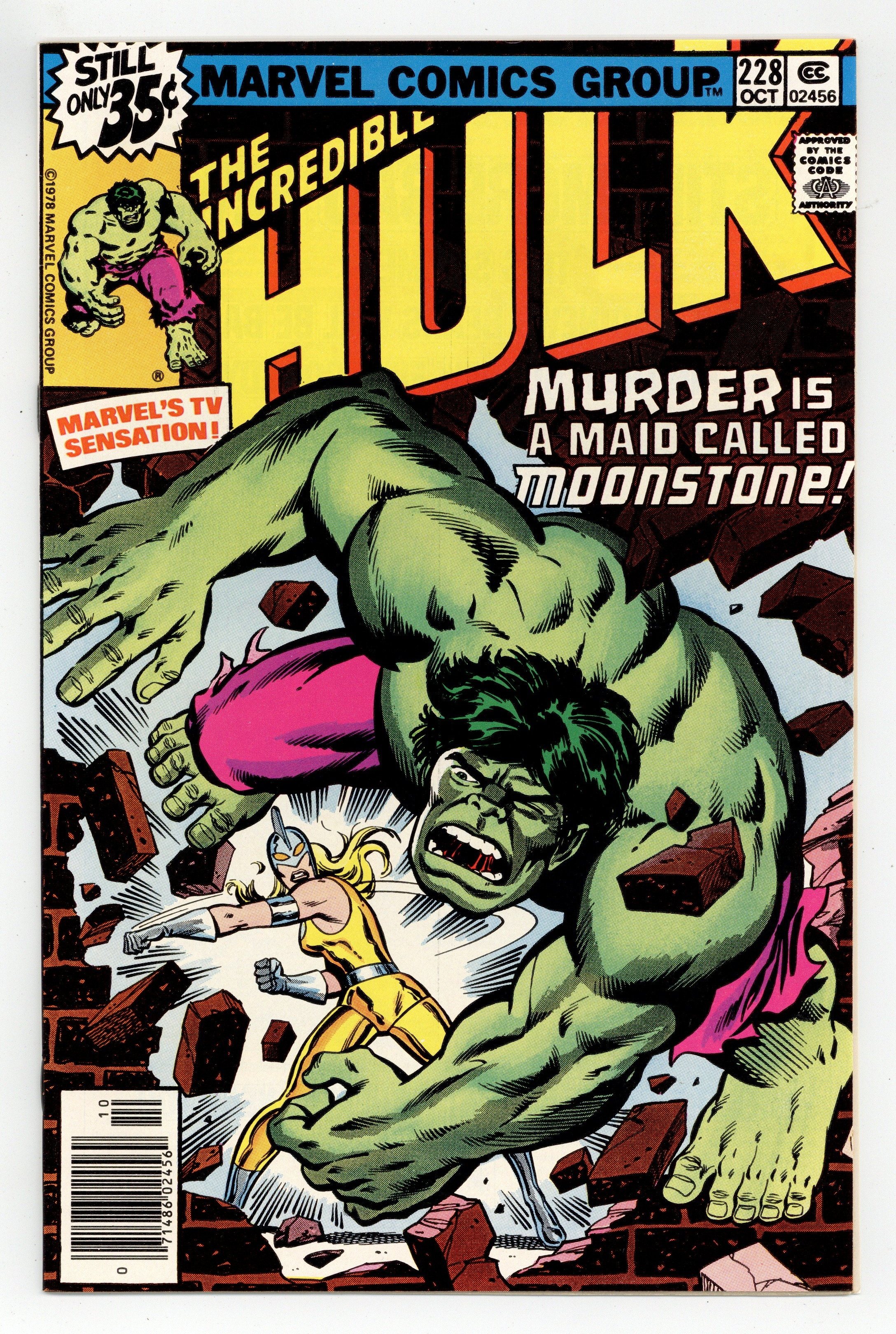 Tags: Marvel Legacy Numbering: Hulk (part 228), Hulk$8.80First appearance of Dr. Karla Sofen as Moonstone in "Bad Moon on the Rise!" Part 1 of 2. Script by Roger Stern and Peter Gillis. Art by Sal Buscema (breakdowns) and Bob McLeod (finishes). Cover by Herb Trimpe and Bob McLeod. At Gamma Base in the Desert Southwest, Doc Samson continues hiswork to find a way to cure the Hulk. And during a break in his research, he receives a phone call from a fellow psychiatrist named Dr. Karla Sofen. She would like to come to Gamma Base and assist with treating the Hulk. Oh, hownice! Doc Samson welcomes her with open arms, but he's not aware of her true intentions. Dr. Sofen is actually there to steal components of theGammavator for the criminal enterprise known as the Corporation. Once Karla completes her evening heist, she thinks she's home free! But on her way out of the storage vault, she runs into the Green Goliath! And then and there,the new Moonstone faces off with her first superhero -- none other than the Incredible Hulk! Cameo appearances by Betty Ross, Kropotkin, Clay Quartermain, General Thunderbolt Ross, and Jim Wilson. (Notes: Dr. Karla Sofen first appeared in Captain America 192. She is the second Moonstone after stealing the alien gemstone from the first Moonstone aka Lloyd Bloch.) 36 pages. Cover price $0.35.