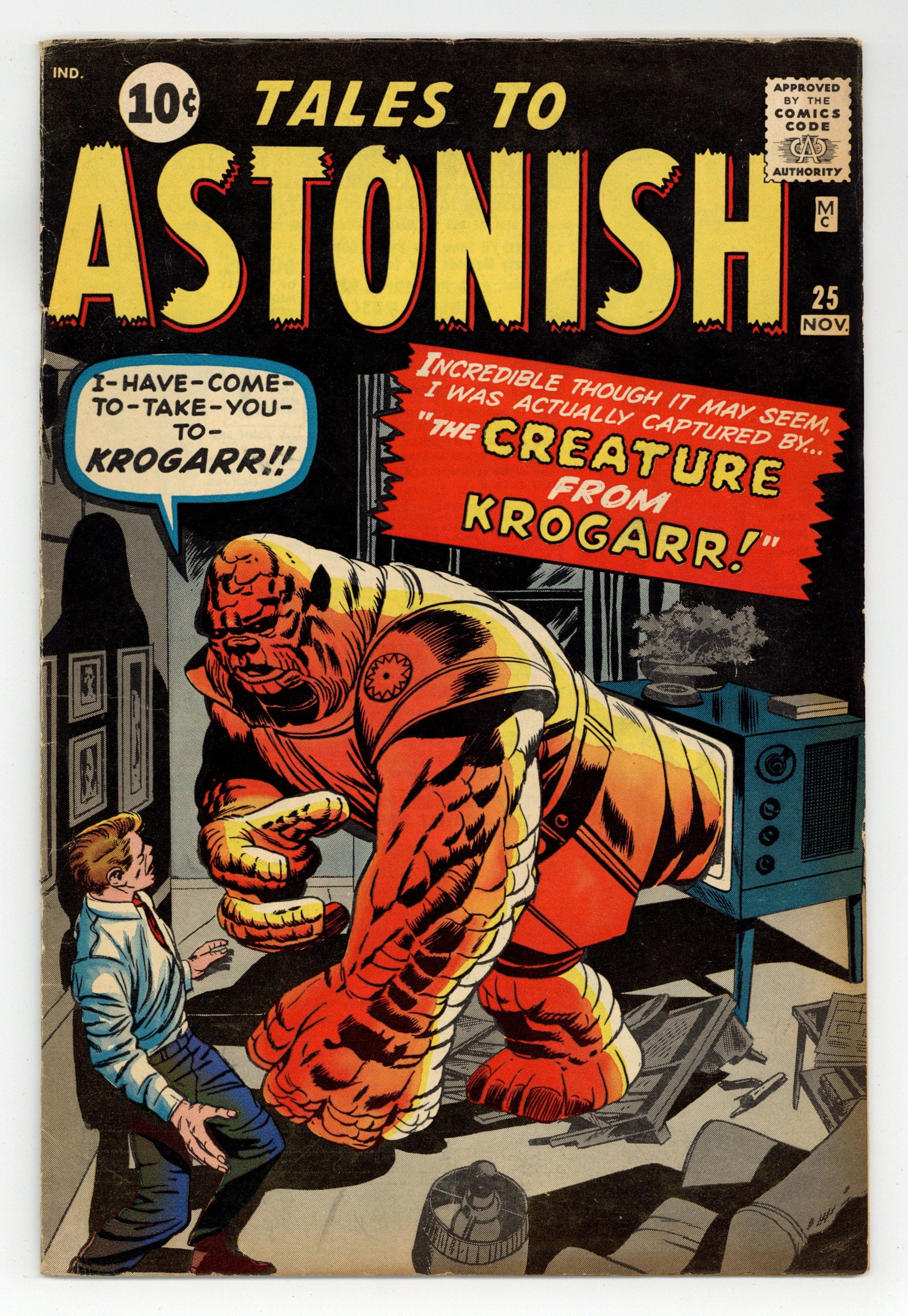 Cover by Jack Kirby and Dick Ayers. I Was Captured by the Creature from Krogarr!, art by Jack Kirby and Dick Ayers; A dissolute human is targeted by an alien that can transport items through television sets, but he is saved by his failure to pay the electric bill. The Party text story. Behold Him! He Is the Martian!, art by Jack Kirby and Dick Ayers; A spy from Jupiter disguised as a human stows away on the first rocket from Earth to Mars. The Gypsy's Revenge!, art by Don Heck; An American criminal robs an old gypsy man, ignoring his pleas and curses. Where Lurks the Ghost!, script by Stan Lee, art by Steve Ditko; A man spends the night in a haunted house with the houses caretaker. 36 pgs., full color. $0.10. Cover price $0.10.