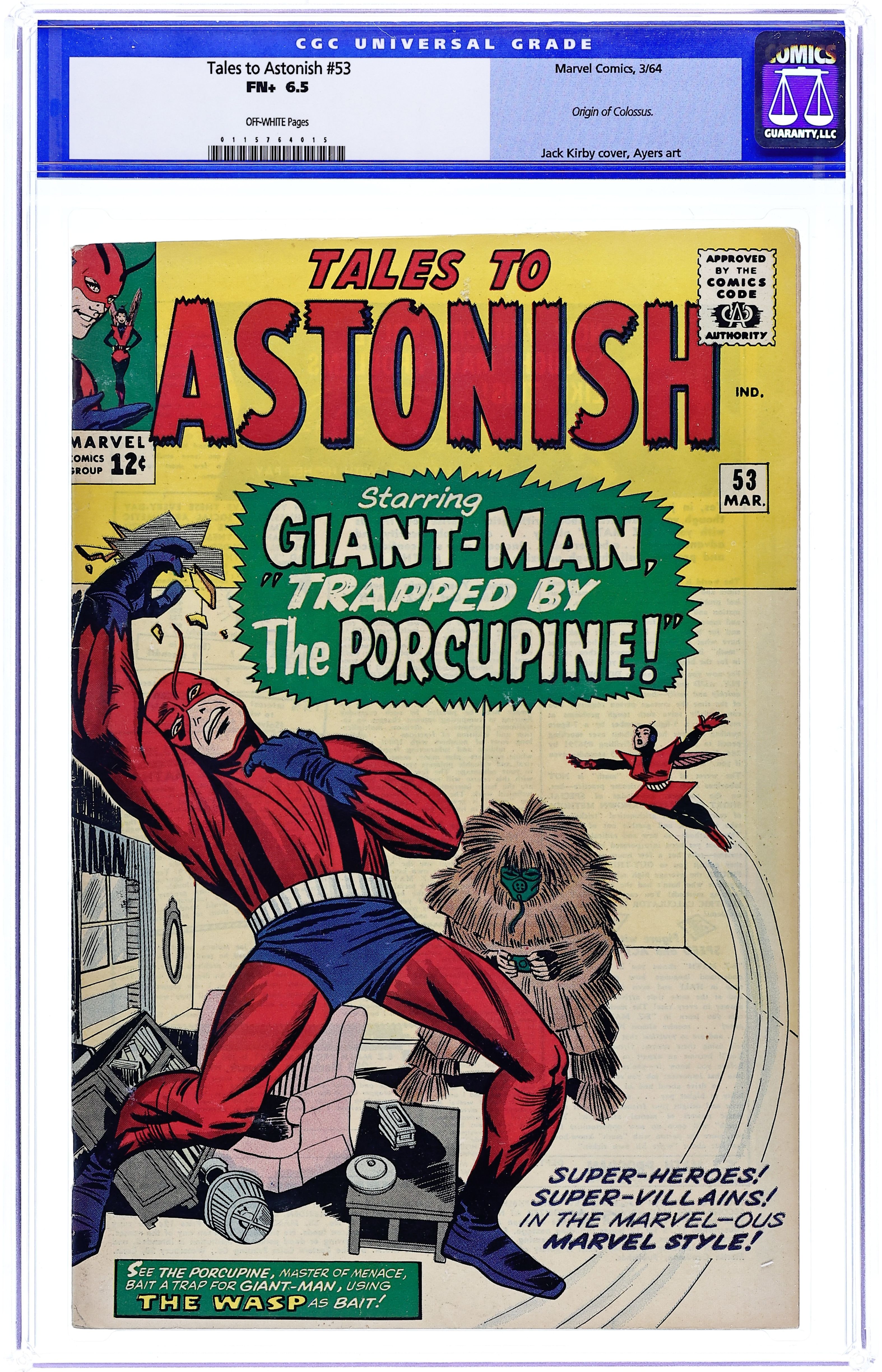 Cover by Jack Kirby and Sol Brodsky. Trapped by the Porcupine!, script by Stan Lee, art by Dick Ayers; The Porcupine uses Giant-Man's fan club to attack him and then he captures the Wasp. The Clock text story. When Wakes the Colossus!, script by Stan Lee and Larry Lieber, art by Larry Lieber and Don Heck; An alien warlord builds a giant statue to intimidate the superstitious, but it comes to life and takes the side of the rebels against him. 36 pgs., full color. $0.12. Cover price $0.12.