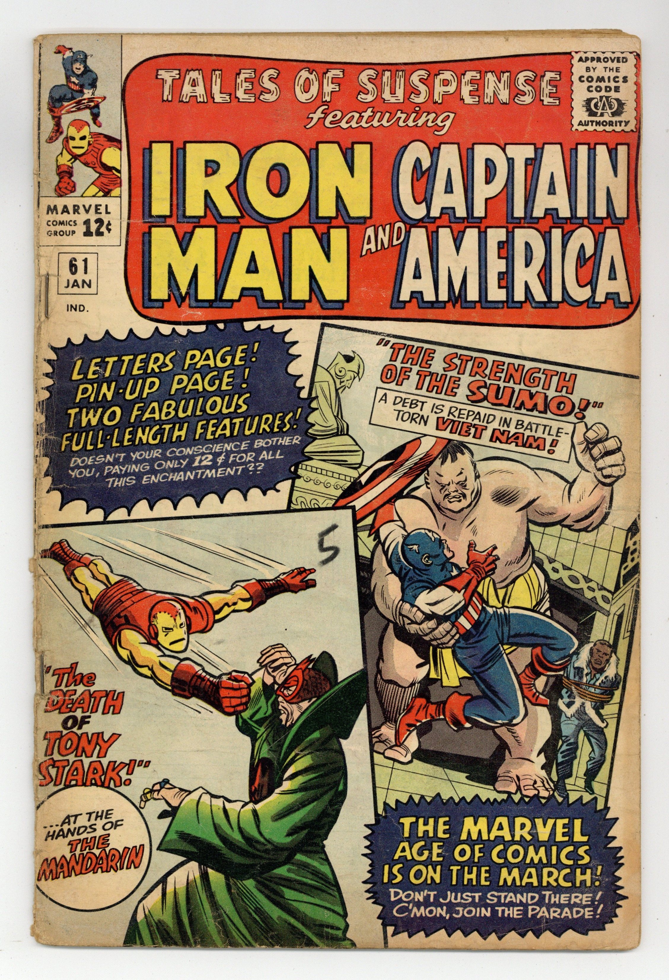 Cover pencils by Jack Kirby, inks by Chic Stone. "The Death of Tony Stark!", script by Stan Lee, pencils by Don Heck, inks by Dick Ayers; Iron Man versus Mandarin and his giant robot Koto. Iron Man pinup by Don Heck. "The Strength of the Sumo!", script by Stan Lee, pencils by Jack Kirby, inks by Chic Stone; Captain America goes into Viet Nam to rescue prisoner of war Baker, and must face the Sumo. Letter from Pete Von Sholly (future comics artist). 36 pages, full color. Cover price $0.12.