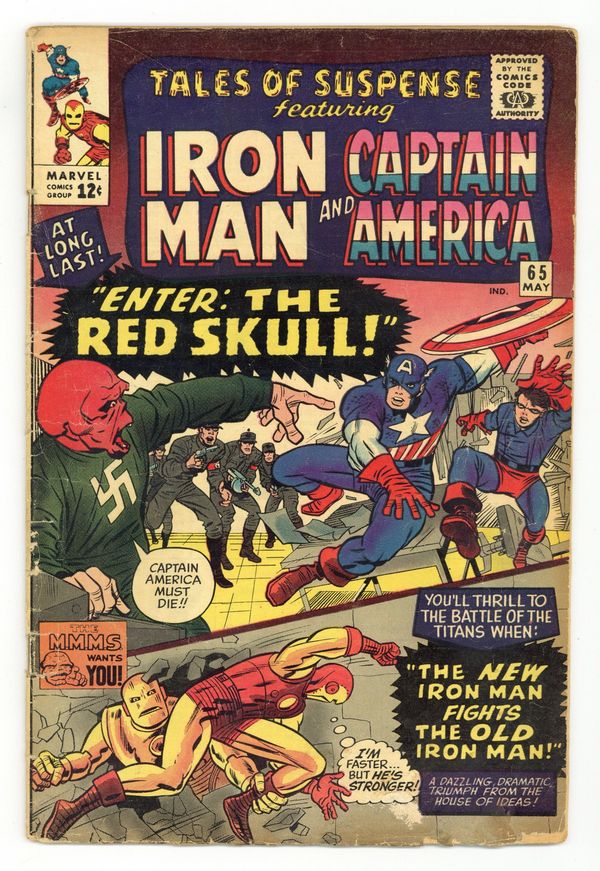 Cover pencils by Jack Kirby, inks by Chic Stone. "When Titans Clash!", script by Stan Lee, pencils by Don Heck, inks by Mike Esposito (as Mickey Demeo); Small-time burglar Weasel Wills stumbles upon Iron Man's armor and Tony Stark must don his old armor to stop his crime spree. First Silver Age appearance of the Red Skull (turns out to be an imposter; the real one appears next issue) in "The Red Skull Strikes!", script by Stan Lee, pencils by Jack Kirby, inks by Chic Stone; Cap and Bucky track down the Red Skull, only to discover that he is an imposter who replaced tycoon Maxon; The real Red Skull is manipulating the "Maxon" Skull; This is a re-telling of "The Riddle of the Red Skull" from Captain America Comics # 1, March 1941. 36 pages, full color. Cover price $0.12.