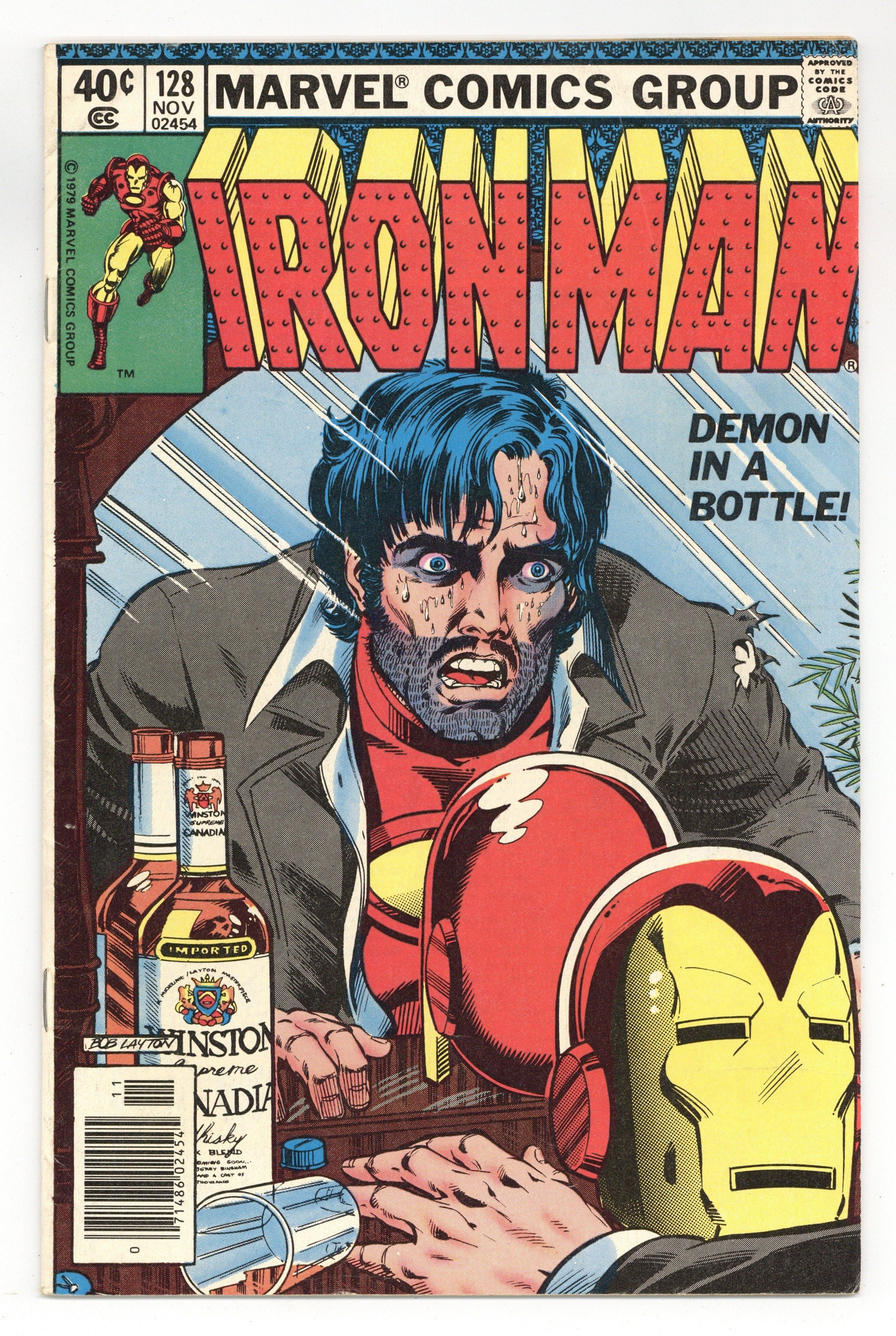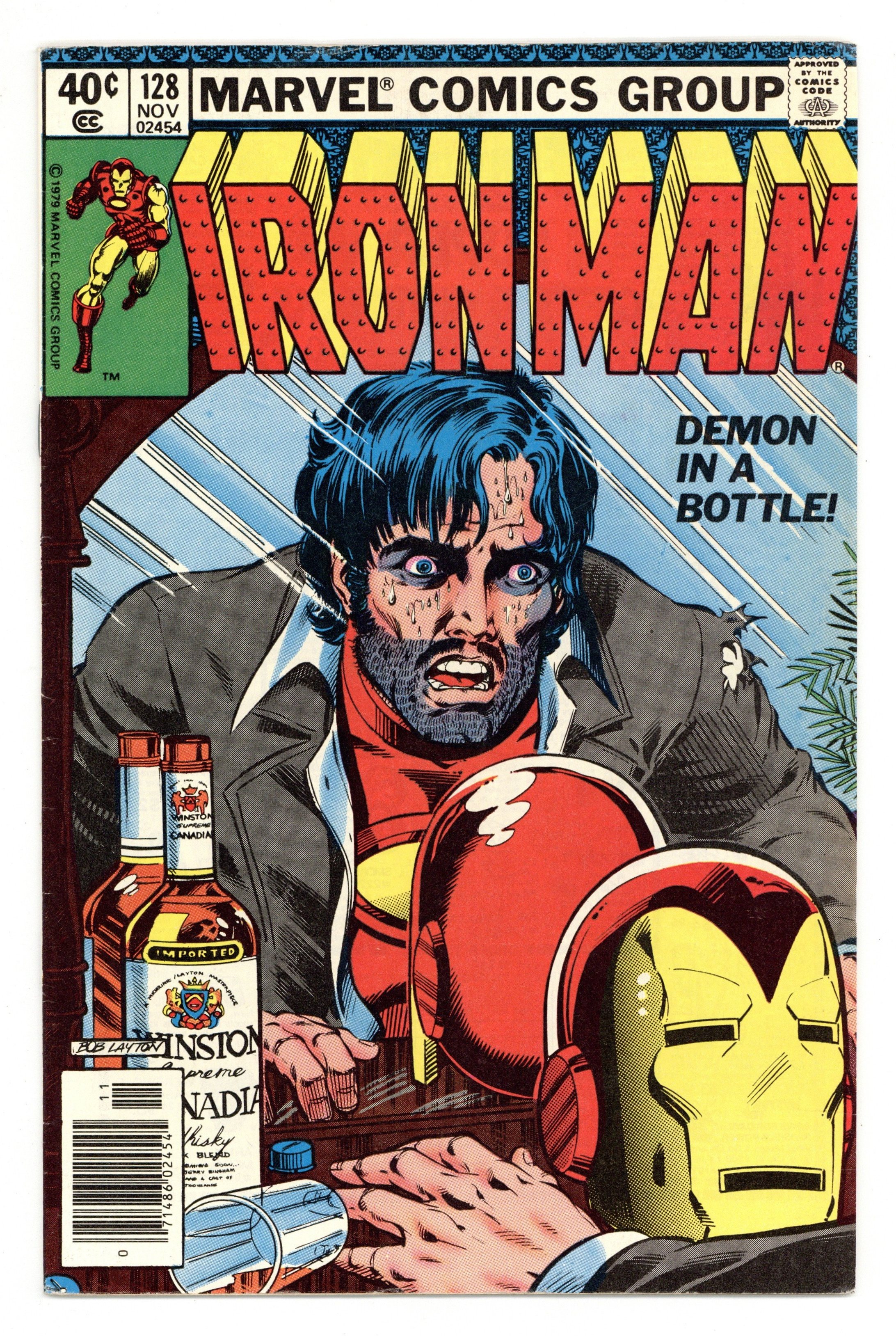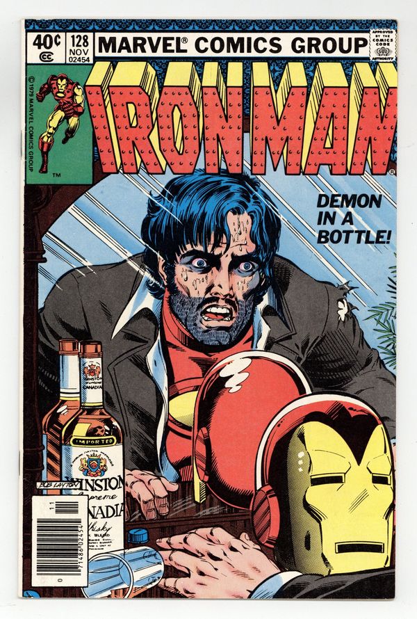 Newsstand Edition. "Demon in a Bottle" Plot by David Michelinie and Bob Layton. Script by David Michelinie. Art by John Romita Jr. (breakdowns) and Bob Layton (finishes). Cover by Bob Layton. One of the most critically acclaimed Iron Man stories, "Demon in a Bottle" explores the flaws of the man behind the helmet. Tony Stark's struggle with alcoholism comes to a head in this pull-no-punches look at his problem. Appearances by Bethany Cabe and Jarvis. (Note: This issue was reprinted in 2006 in the trade paperback: Iron Man Demon in a Bottle; and again in 2008 in the hardcover: Iron Man Demon in a Bottle.) 32 pages. Cover price $0.40.