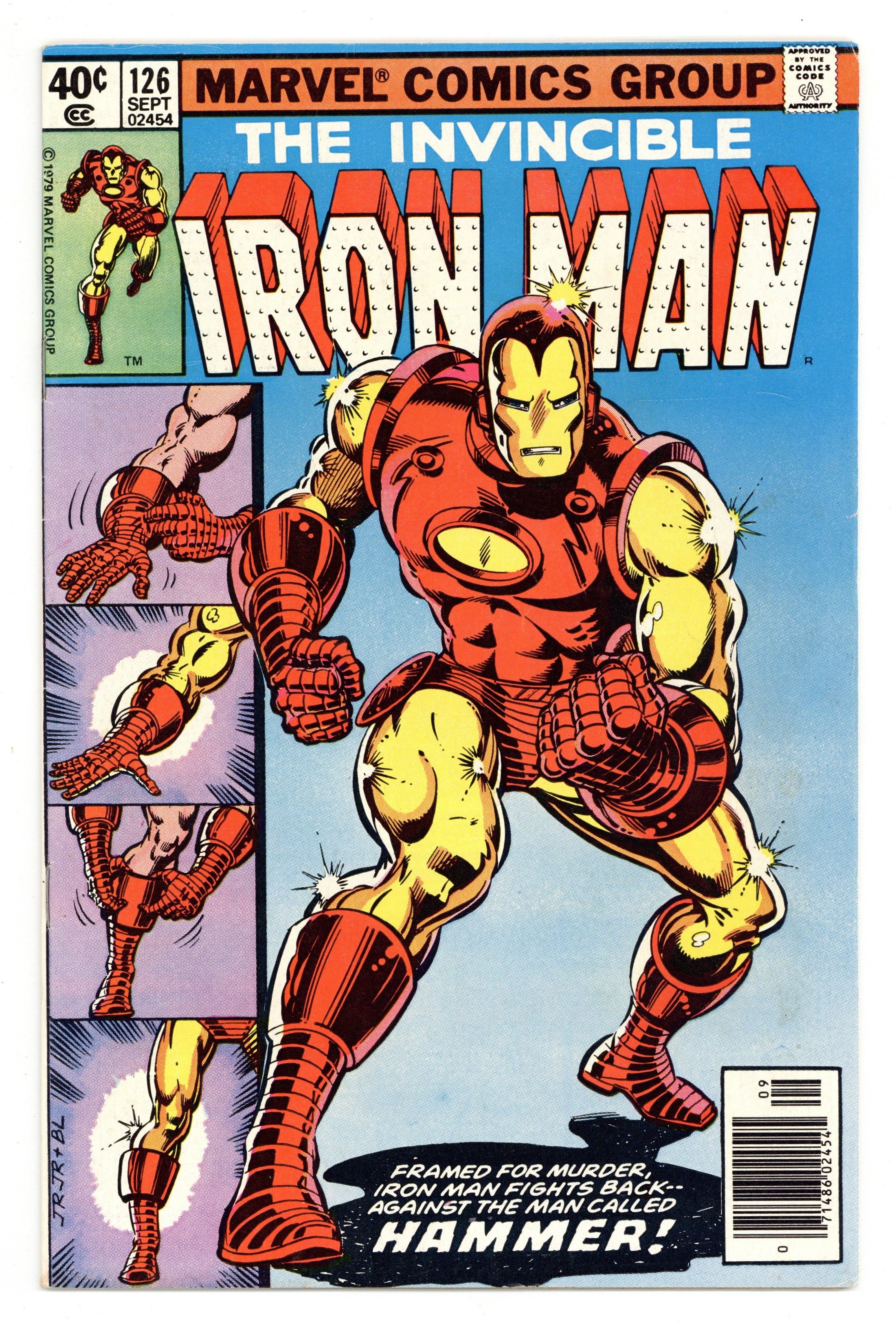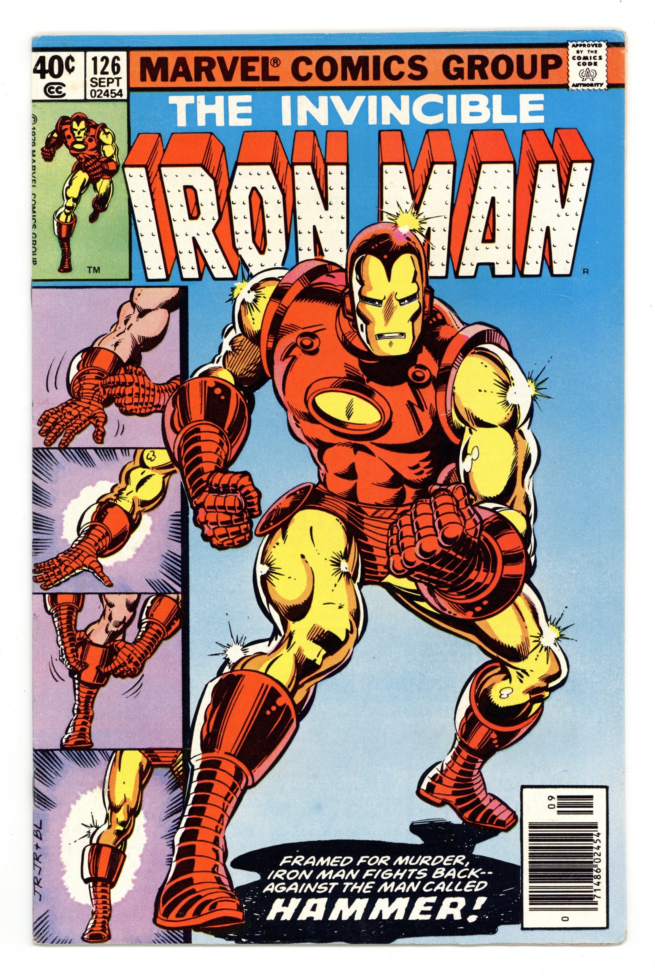 Newsstand Edition. "The Hammer Strikes!" Part 4 of 5. Script by David Michelinie. Art by John Romita Jr. (breakdowns) and Bob Layton (finishes). Cover by John Romita Jr. and Bob Layton. At last Tony Stark comes face-to-face with Justin Hammer! However the circumstances of their first meeting are not favorable to the CEO of Stark International! Tony is a prisoner on Hammer's floating Mediterranean fortress! And his only chance of escape lies in locating his briefcase that contains his backup suit of armor! As shown on the intense cover, the golden avenger indeed finds what he's looking for and successfully suits up! But Justin Hammer has an army of super-villains waiting for him! The battle royal is coming next issue! Cameo appearances by Jim Rhodes, Bethany Cabe, Ling McPherson, the Blizzard, Beetle, Constrictor, Discus, Leap-Frog, Man-Killer, Melter, Porcupine, Spymaster, Stiletto, Water Wizard, and Whiplash. Flashback cameos by Ant-Man and the Avengers. 32 pages. Cover price $0.40.
