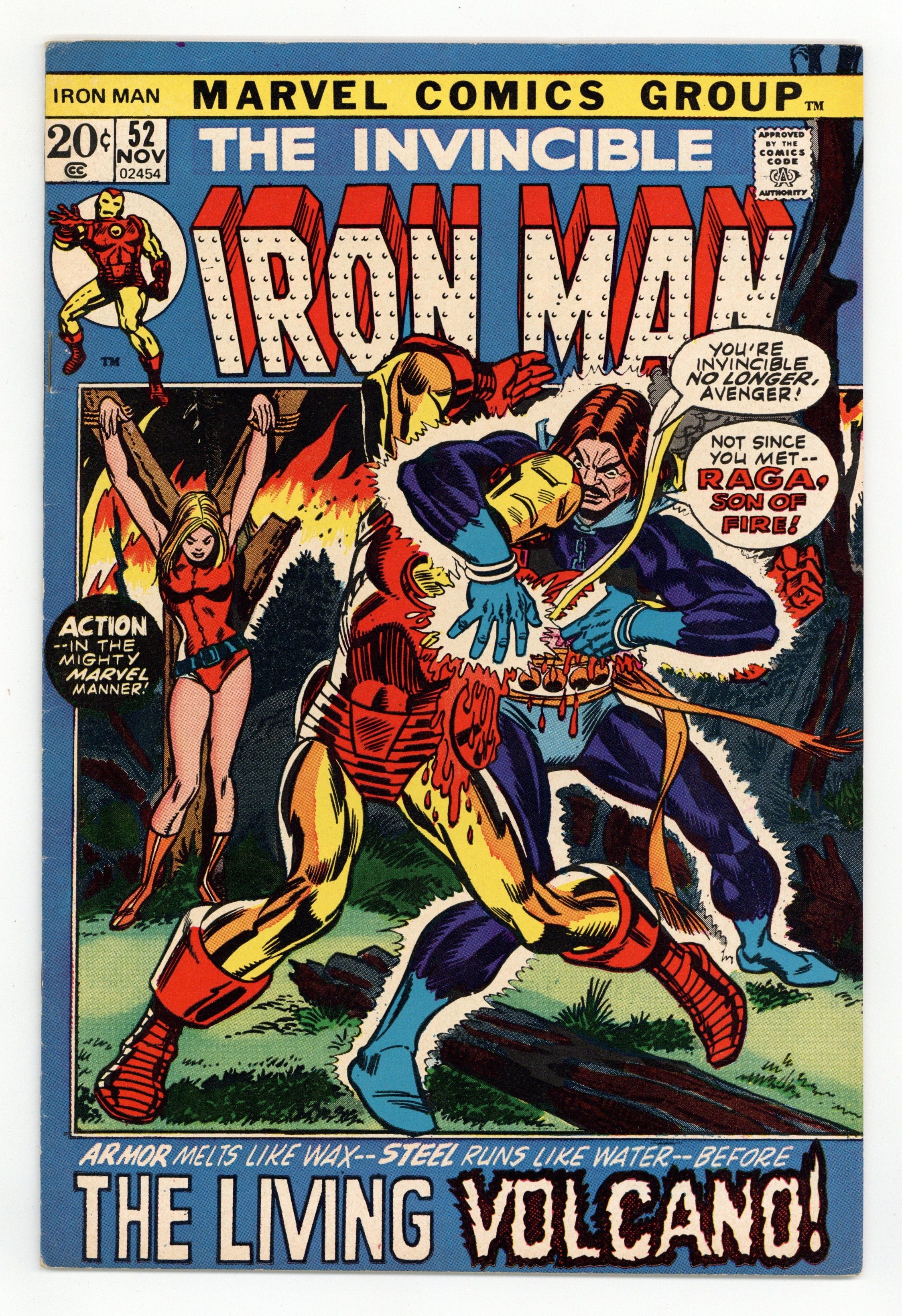 "Raga: Son of Fire!" Story by Mike Friedrich. Art by George Tuska and Vince Colletta. Cover by Gil Kane. Tony Stark decides to get away from New York for a while, so he takes a vacation to California. It's a very relaxing trip until a new villain, Raga, the Son of Fire, starts a forest fire in the Santa Monica Mountains! Shell-Head appears to be on the way to victory until he becomes trapped in a lava flow! (Note: The letters page includes a letter from comics editor David McDonnell. The letters page also includes a letter from Robert Kuntz, one of the early contributors and creators of role-playing games including Dungeons and Dragons.) 32 pages Cover price $0.20.
