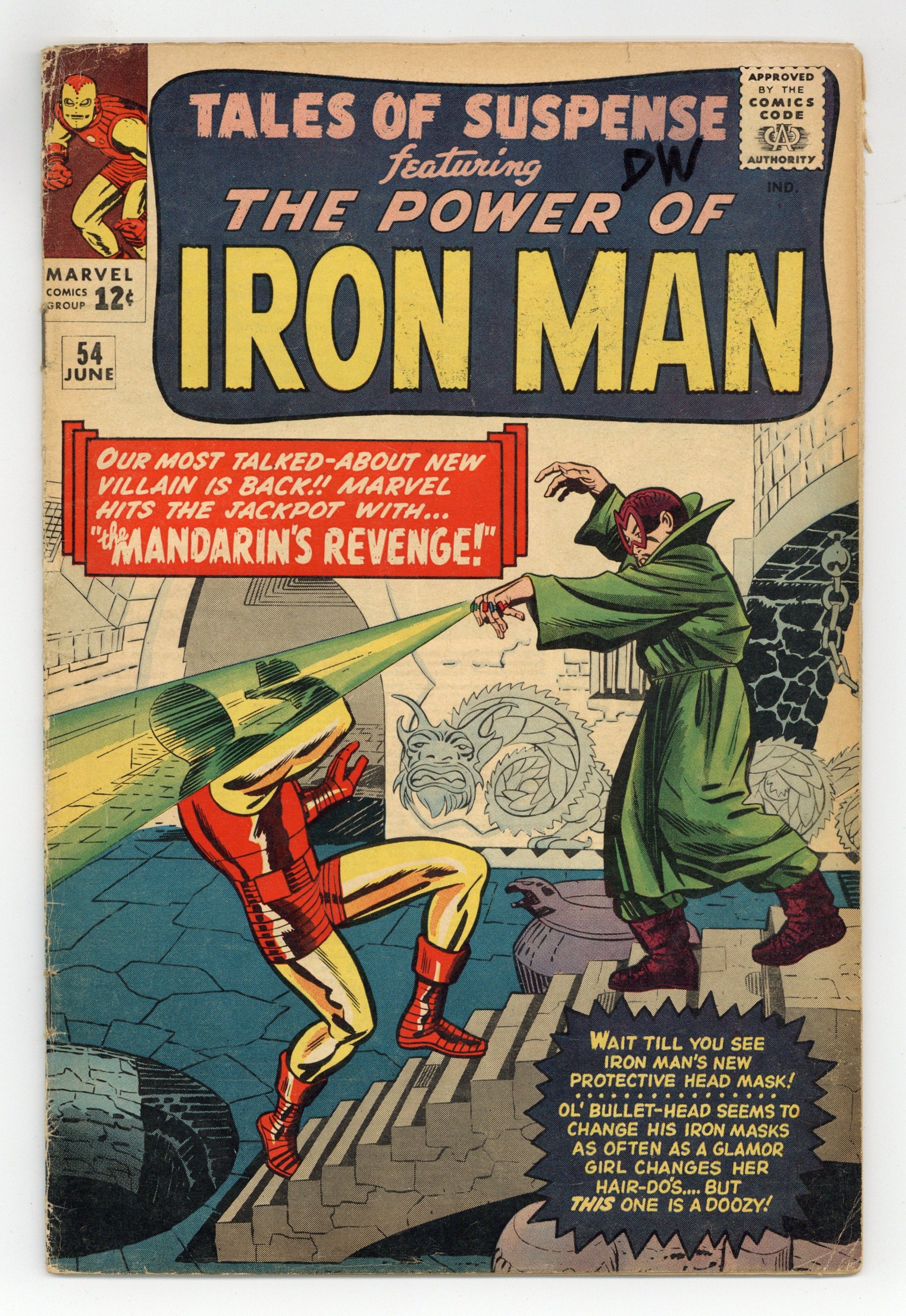 Starts Jan 3 Cover pencils by Jack Kirby, inks by Chic Stone. Iron Man's costume gets a slight re-design in "The Mandarin's Revenge!", script by Stan Lee, art by Don Heck; Tony's observer missiles have failed in Vietnam; So, he goes to investigate, which leads him to the Mandarin; He attacks the Mandarin's castle, but he is captured. "Secret Mission" text story. "Skrang Strikes Tonight!", script by Stan Lee (plot) and Larry Lieber (script), pencils by Larry Lieber, inks by Dick Ayers; An invincible alien invader has weapons that can disable all Earth's armed forces, but he is frightened off when he sees an old lady's fox-fur collar. "Hands Off!", script by Stan Lee (plot) and Larry Lieber (script), pencils by Larry Lieber, inks by Chic Stone; The Watcher is tempted to break his vow of non-interference, but sees that it is for the best to obey. 36 pages, full color. Cover price $0.12.