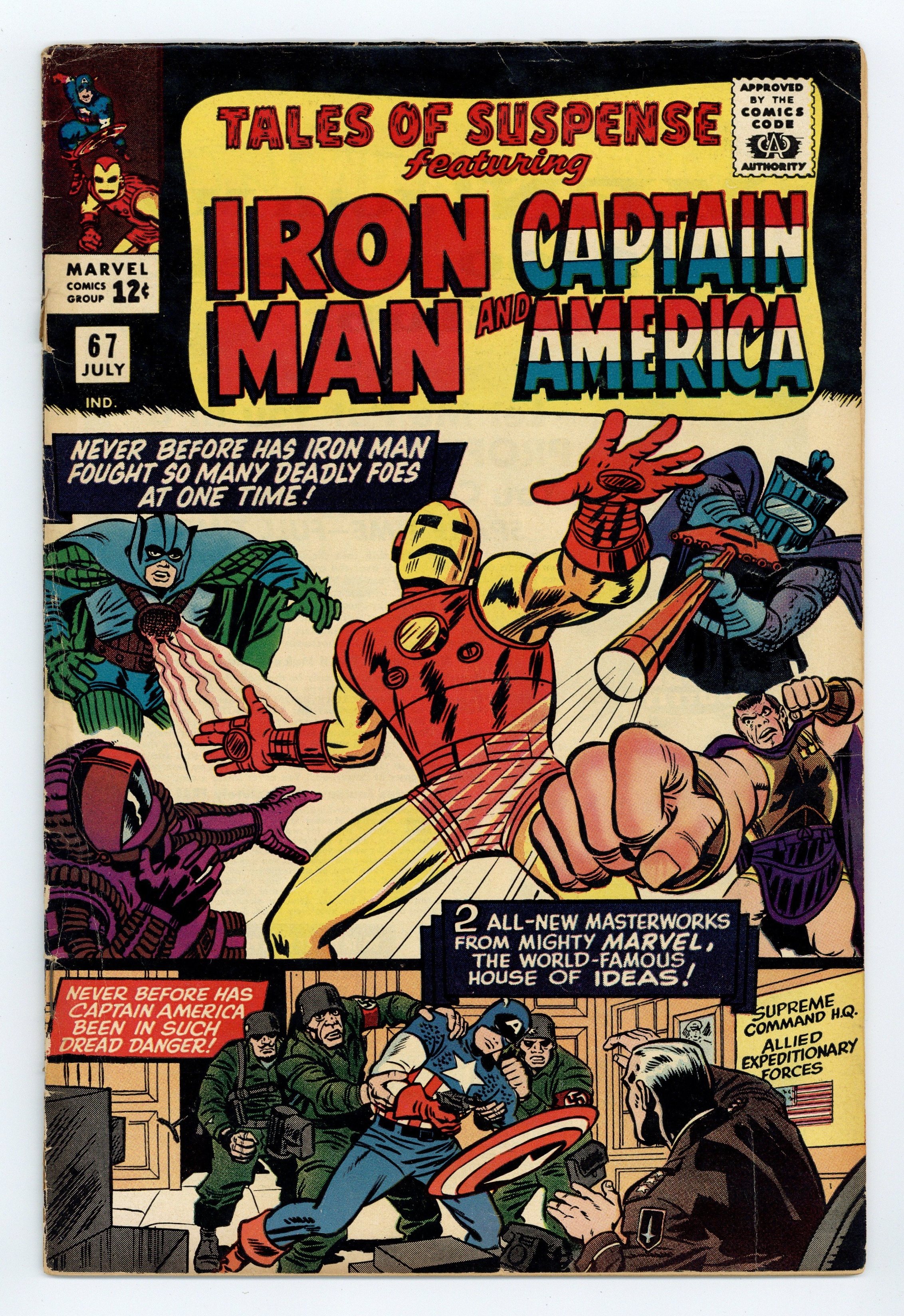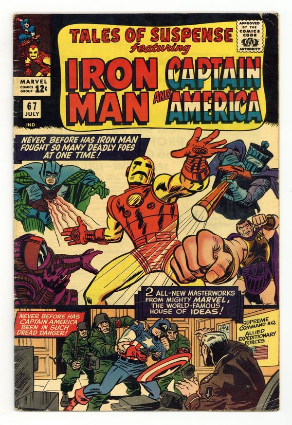 Tags: Marvel Legacy Numbering: Captain America (part 67), Marvel Legacy Numbering: Tales of Suspense (part 67), Captain America, Iron Man$22.50Cover pencils by Jack Kirby. "Where Walk the Villains!", script by Stan Lee, pencils by Don Heck, inks by Mike Esposito (as Mickey Demeo); The Dream-Maker (formerly Count Nefaria) creates hallucinations ("dreams") in which Iron Man must battle some of his former enemies. "Lest Tyranny Triumph!", script by Stan Lee, pencils by Jack Kirby, inks by Frank Giacoia (as Frank Ray); Red Skull and his Nazis are trying to make Cap kill the Allies' high command; Bucky Barnes and Adolf Hitler appear. 36 pages, full color. Cover price $0.12.