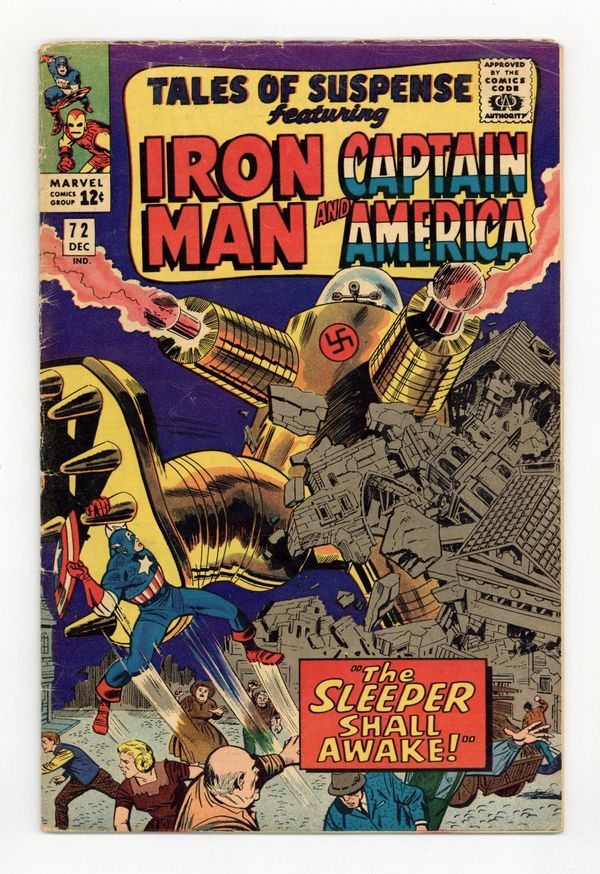 Cover pencils by Jack Kirby, inks by Mike Esposito. "Hoorah for the Conquering Hero!", script by Stan Lee, pencils by Don Heck, inks by Mike Esposito (as Mickey Demeo); Returning to America following his battle against the Titanium Man, Iron Man begins to worry over the fate of his bodyguard Happy Hogan, who was critically injured in that battle. "The Sleeper Shall Awake!", script by Stan Lee, pencils by Jack Kirby (layouts) and George Tuska (pencils), inks by Wally Wood (pages 1-4 uncredited) and George Tuska (pages 5-7) (pages 8-10 uncredited); Captain America goes after the Sleepers, sleeper agents planted by the Red Skull who were to activate the Sleeper robots 20 years after the War; Guest appearances by the Red Skull, the Scarlet Witch, Hawkeye, and Quicksilver. 36 pages, full color. Cover price $0.12.