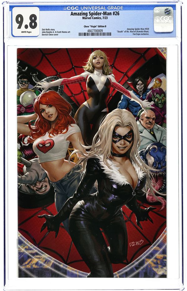 Comics Illuminati (Unknown Comics, The 616, Comic Traders, and Antihero Gallery) Exclusive Virgin Cover by David Nakayama. Written by Joe Kelly. Art by Terry Dodson. Dark Web is over, but the effects will shake Spider-Man for a long time. To recover, Peter Parker and Felicia Hardy, A.K.A. the Black Cat, escape from the city to an exclusive spa in the Catskills! Surely, trouble won't follow our Web-Head and ruin his romantic getaway? Join superstar guest creative team Joe Kelly and Terry Dodson for this special two-parter where Spidey and Black Cat take their next step and no one tries to kill them... yet. Rated T NOTE: The events of this issue take place after Mary Jane and Black Cat (2022 Marvel). 28 pages, full color. Rated T