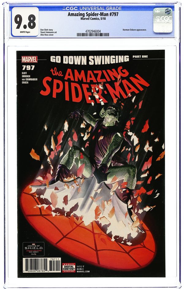 Ends Apr 17 7:21 PM CST Bid History 13 bids Current Bid $46 Your Secret Max Bid If you'd like to bid, please log in or register. Limited 1 for 100 Retailer Incentive Variant Cover. Written by Dan Slott. Art by Stuart Immonen. Cover by Alex Ross. GO DOWN SWINGING Part 2 - Dan Slott's final SPIDER-MAN story continues! The GREEN GOBLIN HAS RETURNED - and he's exacting his ultimate revenge not only on SPIDER-MAN, but on everyone the wall-crawler loves! Norman Osborn's offering NO QUARTER, an ultimatum that threatens to finish PETER PARKER once and for all! 28 pages, full color. Rated T Cover price $3.99.