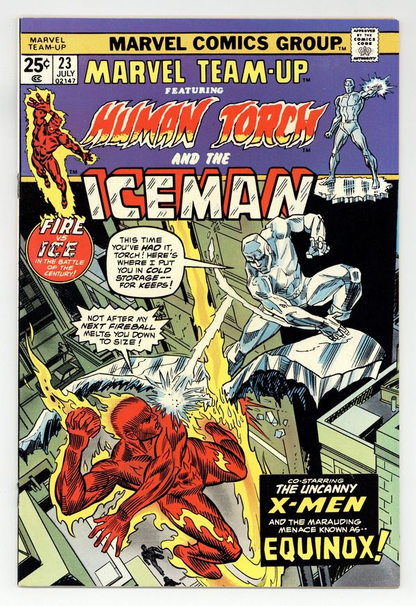 Starts Jan 26 Script by Len Wein. Pencils by Gil Kane. Inks by Mike Esposito and Dave Hunt. Cover by Gil Kane and Frank Giacoia. The Human Torch and Iceman battle Equinox, the Thermodynamic Man, in "The Night of the Frozen Inferno." This story is a continuation from a subplot in Giant-Size Spider-Man #1. Cameo appearances by Spider-Man, Angel, Cyclops, and Marvel Girl. (Equinox returns to battle Spider-Man in Marvel Team-Up #59. Iceman appears next in Giant-Size X-Men #1. The letters page contains Marvel Value Stamp Series A #28, Hawkeye.) 36 pages. Cover price $0.25.