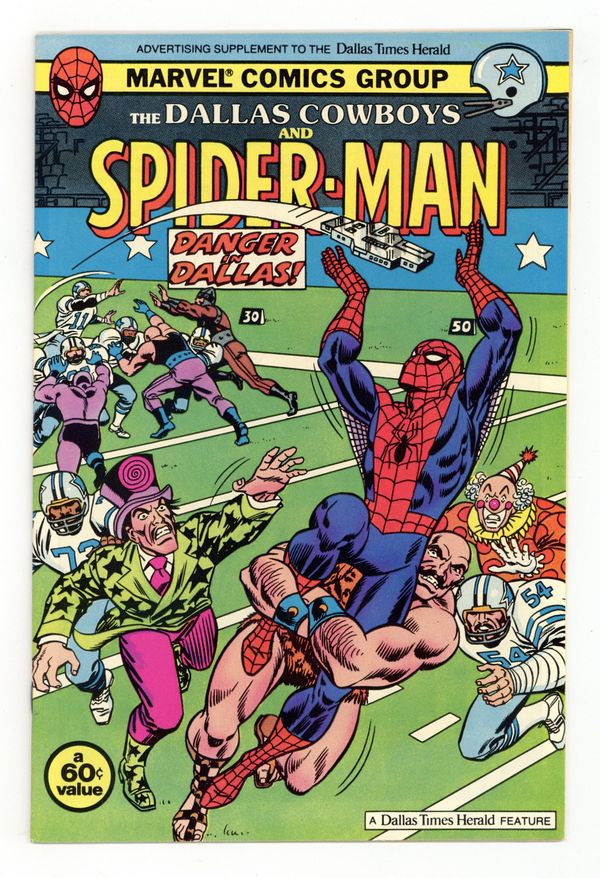Starts Apr 20 Dallas Times Herald giveaway featuring the Dallas Cowboys. Cover art by John Romita. "Danger in Dallas!", script by Marie Severin and David Kraft, pencils by Marie Severin and Kerry Gammill, inks by Mike Esposito; Spider-Man vs. Ringmaster and his Circus of Crime. "Touchdown Maze!" activity page. "The Origin of Spider-Man!" one-page story. "Find the Amazing Spider-Man's Shadow!" activity. "Be a Spider-Man Artist!" activity page. 36 pgs., full color.