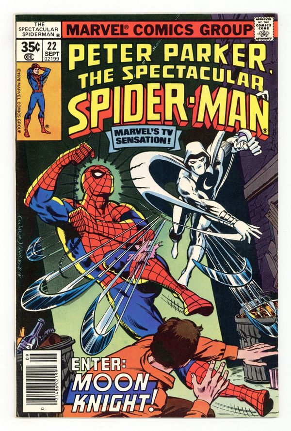 Starts Apr 20 "By the Light of the Silvery Moon Knight!" Part 1 of 2. Guest-starring Moon Knight. Script by Bill Mantlo. Pencils by Mike Zeck. Inks by Bruce Patterson. Cover by Dave Cockrum and Joe Rubinstein. Moon Knight is waging a one-man war against the Maggia! During a hold-up at a local diner, he receives some unwanted help from the Amazing Spider-Man. Are the two heroes going to fight the Maggia or each other? The Maggia doesn't care, because they've imported a super-villain to beat both of them! Cameo appearances by the White Tiger and the Cyclone. (Note: This issue features the first meeting between Moon Knight and Spider-Man.) 32 pages Cover price $0.35.