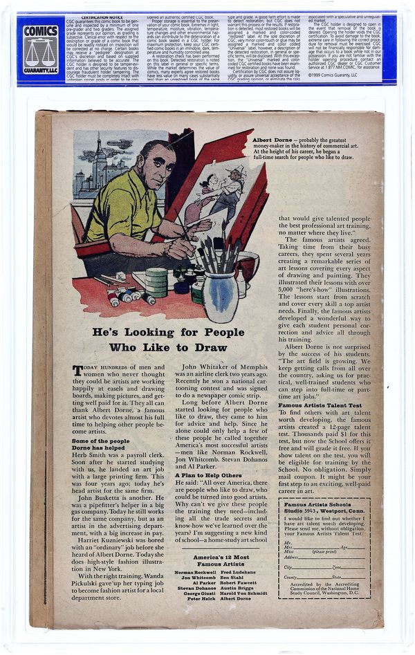 - Restoration includes: small amount of color touch on cover, pieces added to cover, tear seals to cover, cover reinforced. Bottom and right edge of cover trimmer.