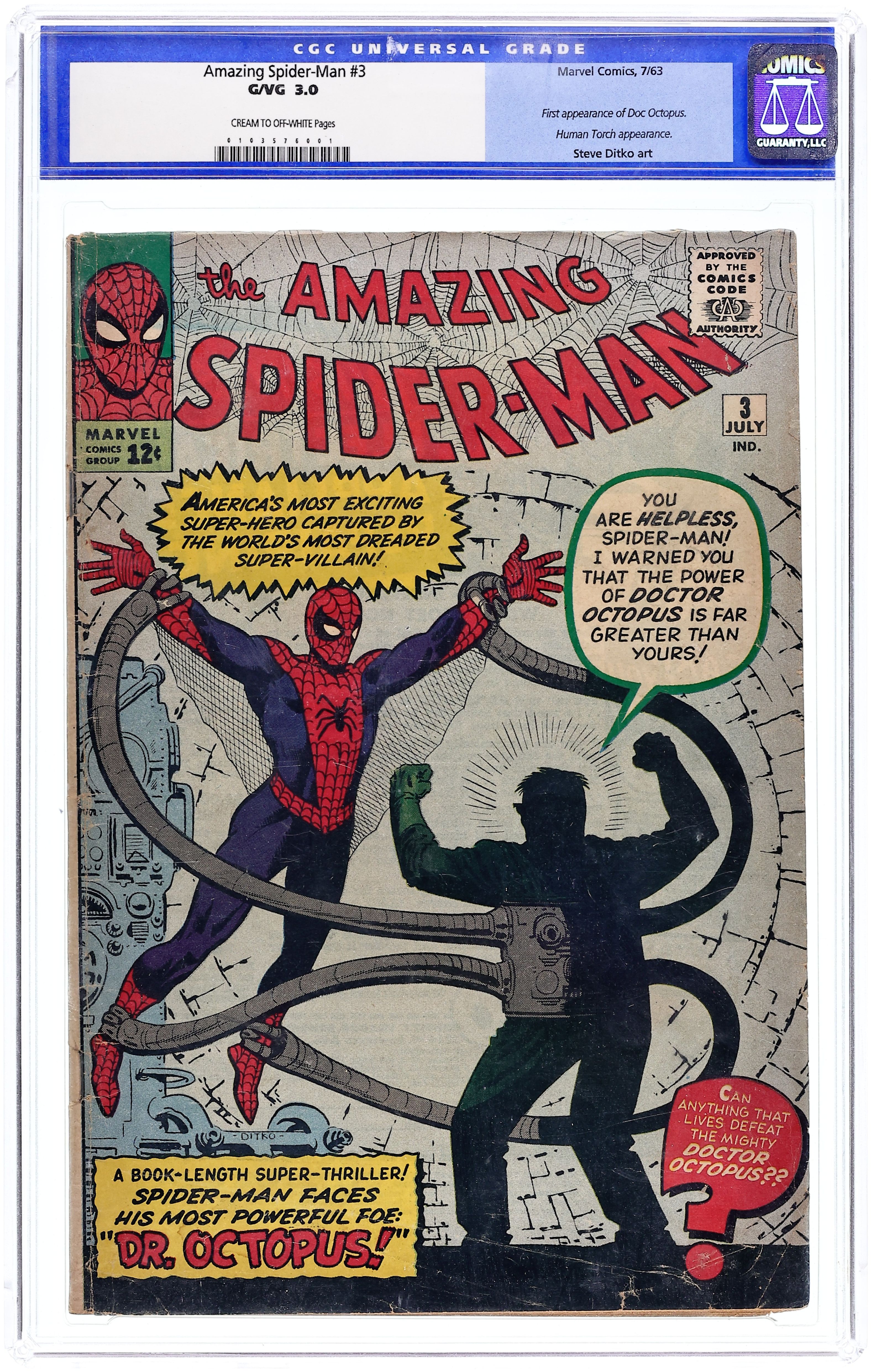 Cover art by Steve Ditko. First appearance of Dr. Octopus in Spider-Man Versus Doctor Octopus, script by Stan Lee, art by Steve Ditko; When an experiment goes wrong, Otto Octavius gains control of his robotic arms and decides to take over an atomic facility, but Spider-Man stops him. Spider-Man pin-up page by Ditko. Reprinted in Marvel Tales # 140. First issue with a letters column (including a letter by MyComicShop president Buddy Saunders!). 36 pgs. $0.12. Cover price $0.12.