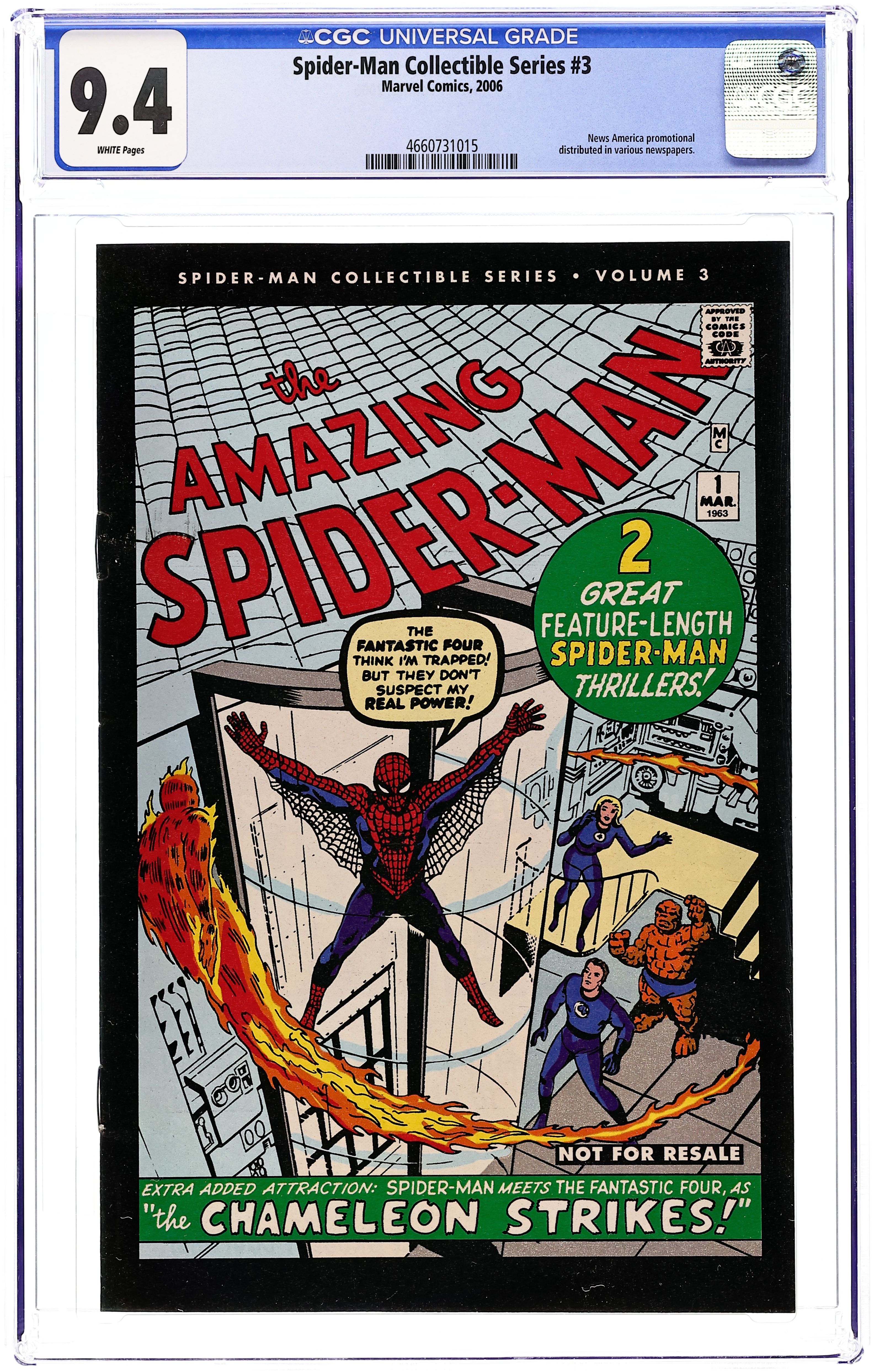 Sales sample edition. Weekly Sunday newspaper inserts. From 8/20/2006 - Reprints Amazing Fantasy #15. Full color, newspaper stock. NOTE: Generic image is of a signed copy, this does not necessarily reflect all copies.