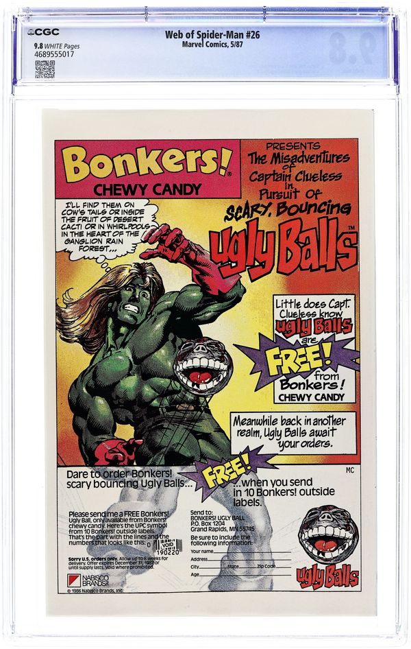 Newsstand Edition. "Welcome To My Nightmare!" Guest-starring the Hulk. Story by Peter David. Art by Sal Buscema and Armando Gil. Cover by Ron Wilson and Brett Breeding. It's an unusual story as Spider-Man is summoned by Nightmare to his nightmare realm in order to stop the rampaging Hulk. Will Peter Parker wake up from his nightmare? (Note: This issue contains a half page ad for the 12-issue Squadron Supreme limited series -- written by Mark Gruenwald.) 32 pages Cover price $0.65.