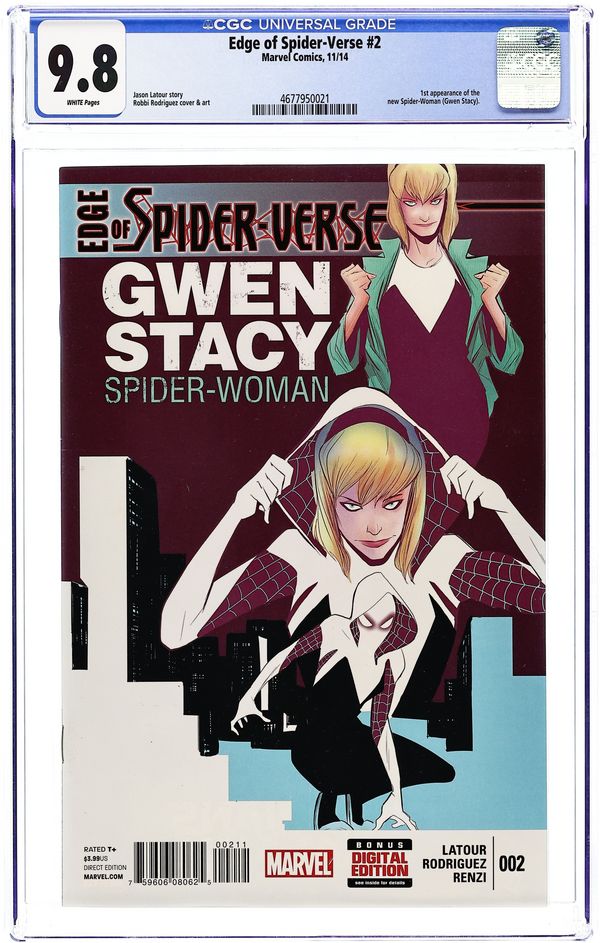 Edge of Spider-Verse: Part 3 of 10 - Written by Jason Latour. Art and Cover by Robbi Rodriguez. GWEN STACY: SPIDER-WOMAN! In one universe, it wasn't Peter Parker bitten by the radioactive Spider, but Gwen Stacy! She's smart, charming and can lift a car-- Just don't tell her Police Chief father! How is she involved in Spider-Verse? Seeds of AMAZING SPIDER-MAN #9 are planted here! 28 pages, full color. Rated T+ Cover price $3.99.