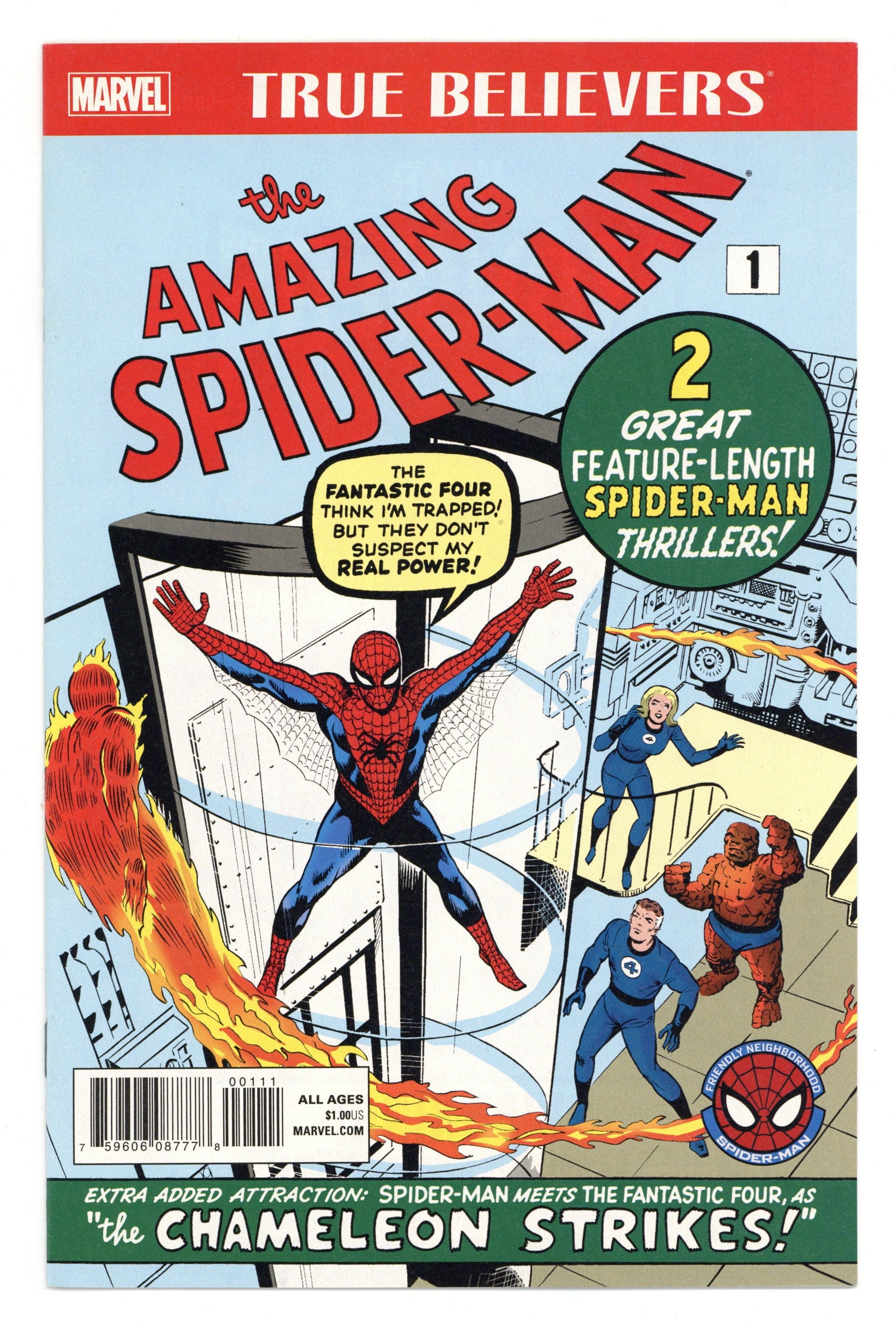 Written by Stan Lee. Art by Steve Ditko. Cvoer by Jack Kirby and Steve Ditko. Reprinting Amazing Spider-Man (1963) 1: Spider-Man origin retold; J. Jonah Jameson introduced; Spider-Man rescues John Jameson, J. Jonah Jameson's son, from his malfunctioning space capsule. Spider-Man tries to join the Fantastic Four and stops the Chameleon. Cover price $1.00.