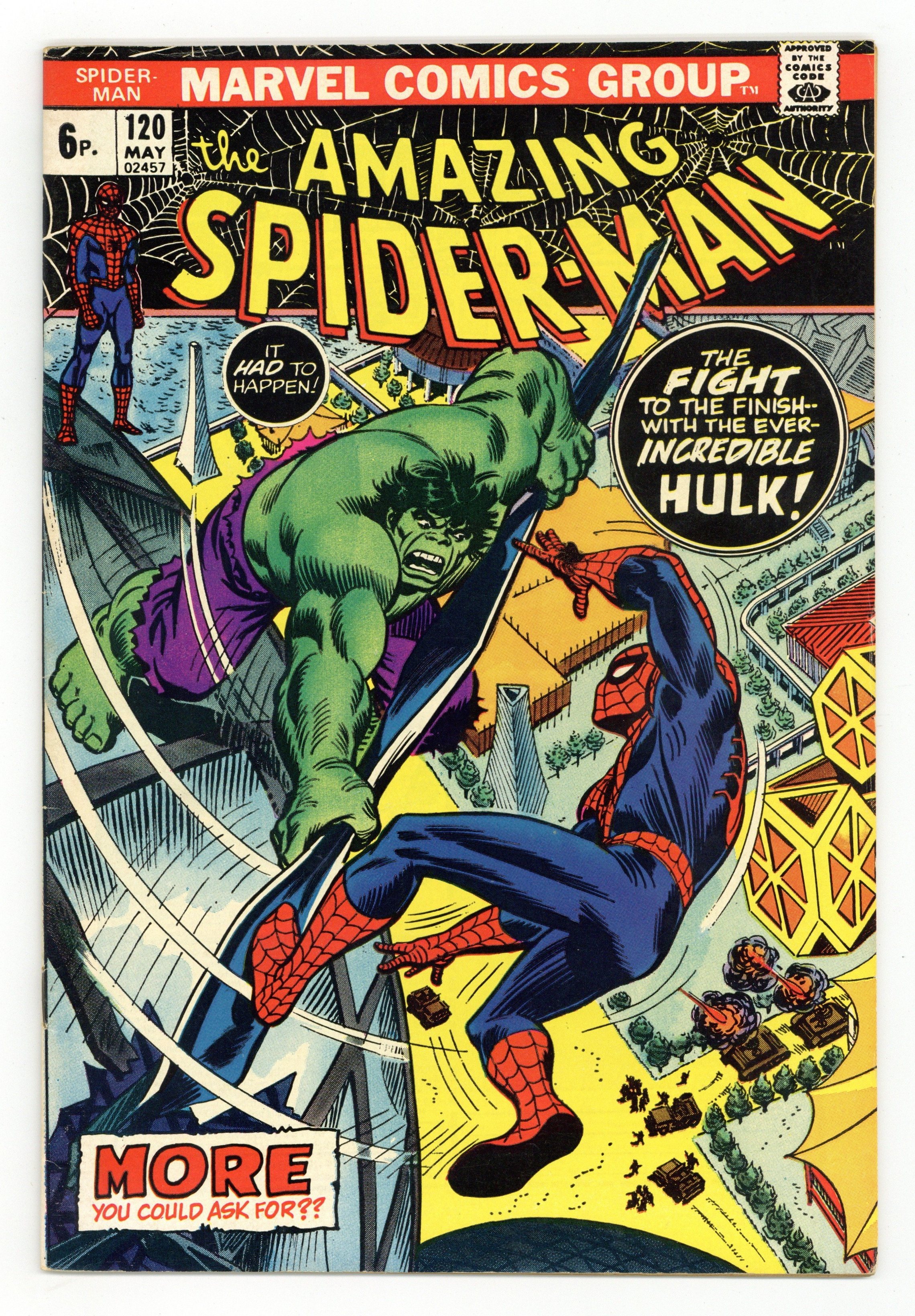 UK edition. Identical to US edition, but has 6p cover price. Cover by John Romita Sr. The Fight and The Fury!, script by Gerry Conway, pencils by Gil Kane and Paul Reinman (art assist), inks by John Romita and Tony Mortellaro; Peter Parker is in Montreal in response to a mysterious telegram to Aunt May; While he's there, Spider-Man battles the Hulk, with General Ross being a nuisance. Announcement of FOOM (Friends of Ol' Marvel) fan club with list of premiums and a mail-in coupon. Ad for the Dracula Lives magazine, art by Gene Colan. 36 pgs., full color.