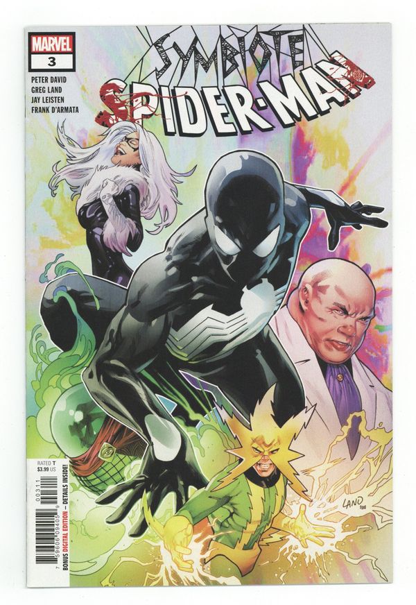 Written by Peter David. Art and Cover by Greg Land. From comic titans, Peter David and Greg Land, comes the third installment of an all-new Spider-Man tale set during the original ALIEN COSTUME SAGA! After glimpsing the strange abilities of Spider-Man's bizarre black suit, Mysterio is determined to uncover the secrets of the enigmatic ensemble - secrets Peter Parker hasn't even realized! Uncovering a shameful secret from Black Cat's past, Mysterio may have found the blackmail necessary to get close to the suit, and in doing so will set Felicia down a path where any misstep could result in her losing Peter forever! 28 pages, full color. Rated T Cover price $3.99.