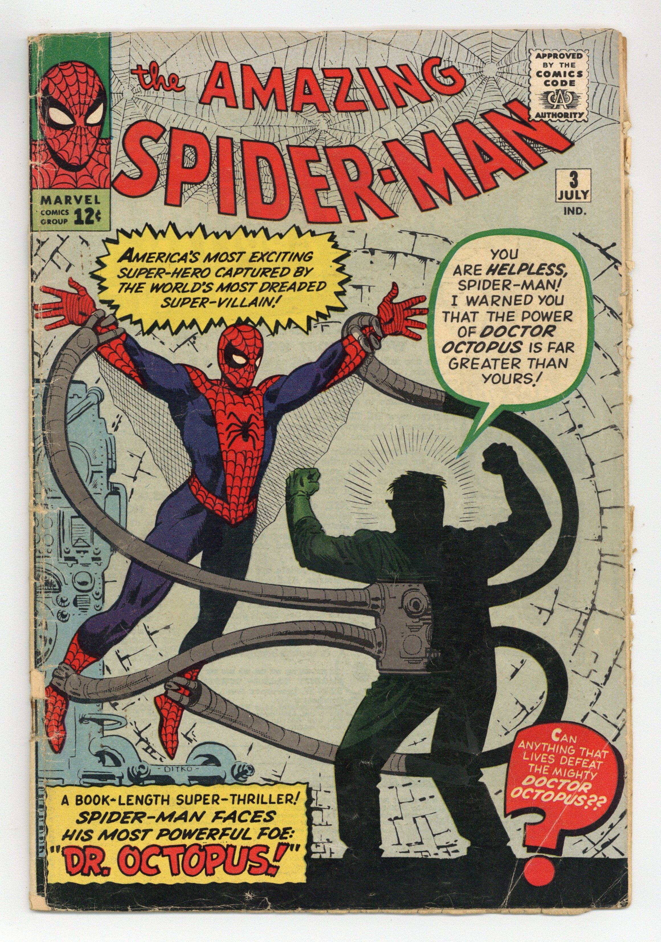 Cover art by Steve Ditko. First appearance of Dr. Octopus in Spider-Man Versus Doctor Octopus, script by Stan Lee, art by Steve Ditko; When an experiment goes wrong, Otto Octavius gains control of his robotic arms and decides to take over an atomic facility, but Spider-Man stops him. Spider-Man pin-up page by Ditko. Reprinted in Marvel Tales # 140. First issue with a letters column (including a letter by MyComicShop president Buddy Saunders!). 36 pgs. $0.12. Cover price $0.12.