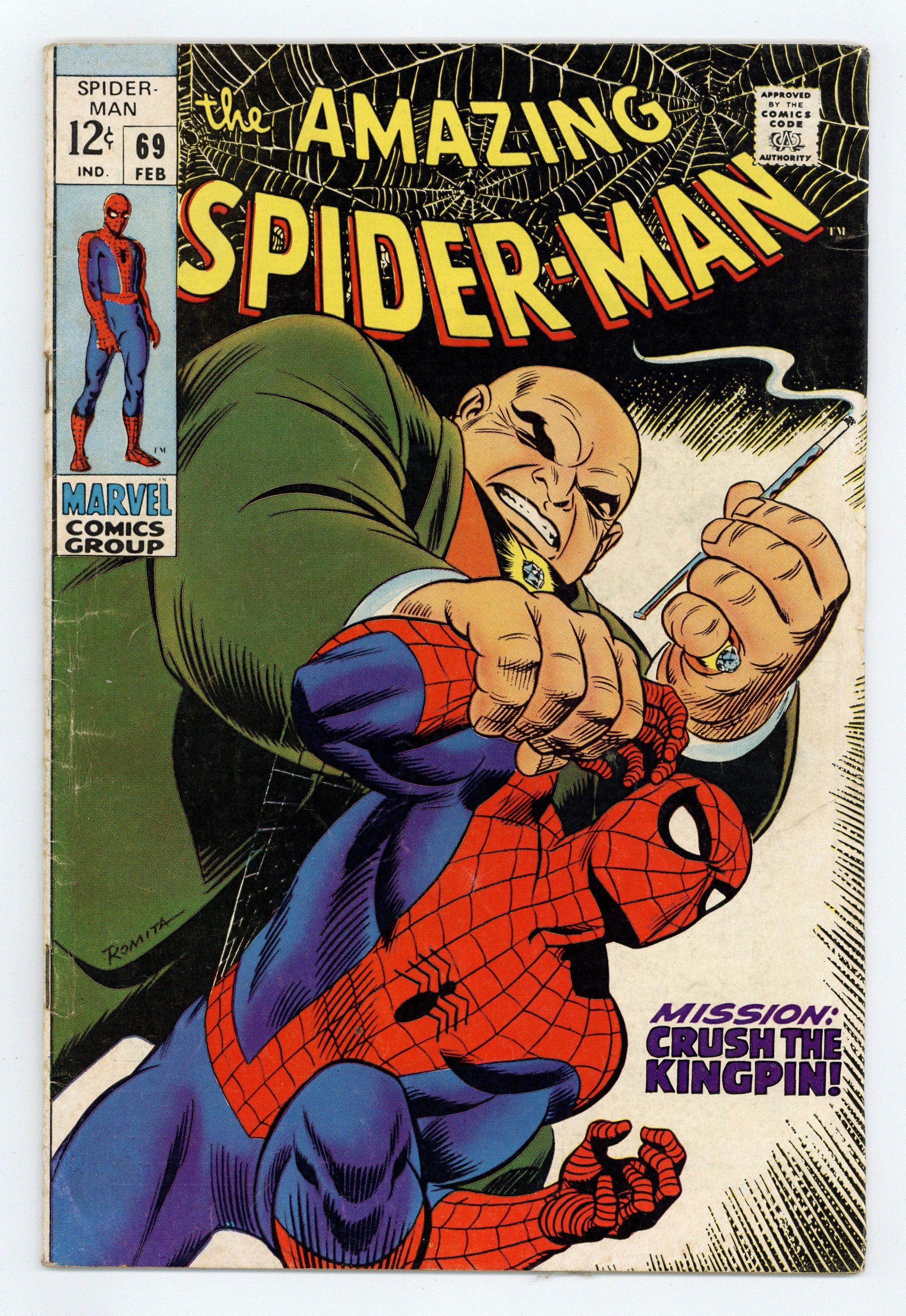 Tags: Marvel Legacy Numbering: Amazing Spider-Man (part 69), Spider-Man$60.00"Mission: Crush the Kingpin!" Part 2 of 3. Plot by John Romita. Script by Stan Lee. Art by John Romita (layouts) and Jim Mooney (finishes). Cover by John Romita. The Spectacular Spider-Man is on the hunt for the Kingpin-- after the crime boss stole the ancient clay tablet from the ESU exhibit hall. However the Kingpin actually wants the web-slinger to find him, so he can polish off the wall-crawler permanently! When the amazing one locates Wilson Fisk's hideaway...another great battle between Spider-Man and the Kingpin erupts! Who will win this time? And where is the clay tablet? Cameo appearances by Captain Stacy, Gwen Stacy, J. Jonah Jameson, Joe Robertson, and Randy Robertson. (Notes: The first mention of the Kingpin's wife occurs in this issue. The letters page includes a letter from comics artist Kerry Gammill. This story was reprinted in Marvel Tales #52.) 36 pages. Cover price $0.12.