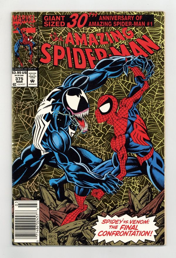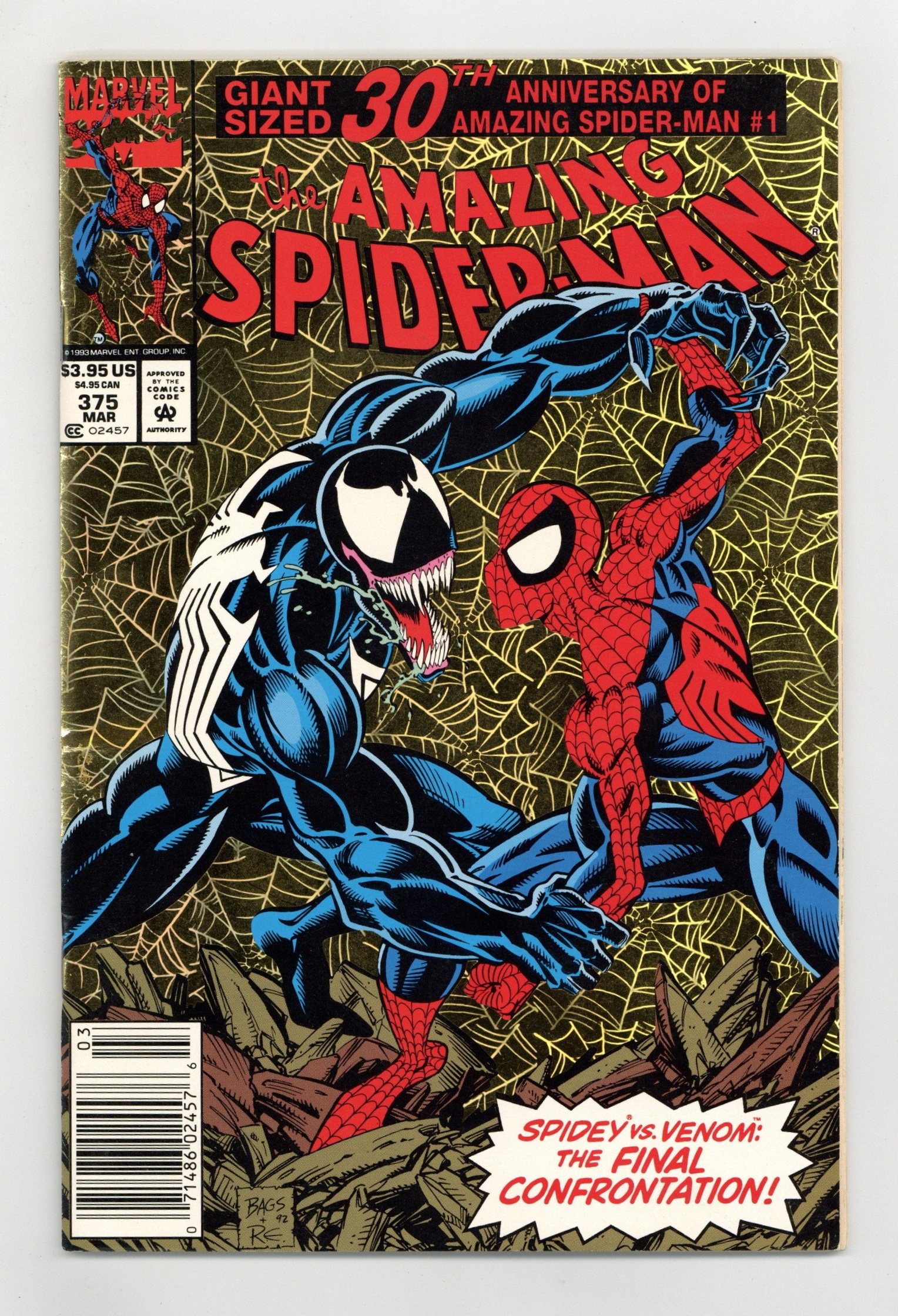Newsstand Edition. 30th Anniversary issue of Amazing Spiderman #1. "The Bride of Venom" Part 2 of 2. Script by David Michelinie. Pencils by Mark Bagley. Inks by Randy Emberlin. Gold foil holografix cover by Mark Bagley and Randy Emberlin. Inside an abandoned Brooklyn amusement park, the Lethal Protector holds Richard and Mary Parker captive! The disturbed Venom thinks he's just doing what's best for Peter's parents! But that's not going to work! No way, no how! So, the wall-crawler heads to the park knowing a fierce fight awaits! However, the web-slinger may have help this time from a very unlikely source...Eddie Brock's ex-wife! Wow, will there be a family reunion atop the Ferris wheel? Or perhaps a funeral beneath it? One way or another, the Amazing Spider-Man and Venom battle for the last time! Cameo appearances by Silver Sable, Battlestar, Mary Jane Watson, and J. Jonah Jameson. Second story: "True Friends!" Script by Tom DeFalco. Pencils by Patrick Olliffee. Inks by Mark McKenna. Aware of what the Human Torch did to Empire State University, Spider-Man vows to bring his friend to justice. Cameo appearance by Silver Sable. Plot crosses over with Fantastic Four 373 & 374. Third story: "The Monster Within" Script by Eric Fein. Art by Dan Panosian. JJJ tries to get his son, John Jameson, started in the field of journalism. Fourth story: "Echoes..." Script by Terry Kavanagh. Pencils by Aaron Lopresti. Inks by Don Hudson. The Chameleon visits the grave of Kraven the Hunter. (Notes: Venom appears next in the first issue of his Lethal Protector (1993) series. The letters page includes a statement of ownership: average print run 660,958. average paid circulation 544,900.) 68 pages. Cover price $3.95.