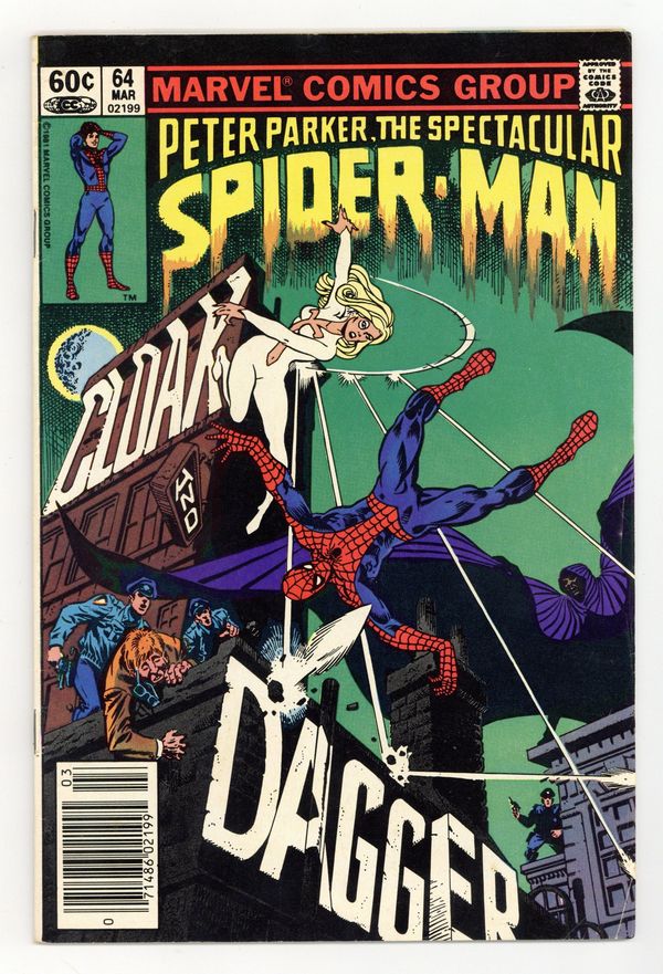 Newsstand Edition. "Cloak and Dagger!" Script by Bill Mantlo. Pencils by Ed Hannigan. Inks by Al Milgrom. Cover by Ed Hannigan and Al Milgrom. On a quiet night in Manhattan, the web-slinger is traveling across the city when he suddenly hears a desperate plea for help from a man running for his life! The frantic pharmacist is trying to escape from...Cloak and Dagger! The wall-crawler quickly engages the light-and-dark pair, but falls in battle to the duo's unusual powers. The next day Peter Parker picks up the investigation, and the trail of Cloak (aka Tyrone Johnson) and Dagger (aka Tandy Bowen) leads to Ellis Island! Is the Spectacular Spider-Man ready for round two with Cloak and Dagger? First appearance of Cloak and Dagger. (Notes: This issue includes a full-page ad/pin-up of Spider-Man fighting Dr. Octopus and promoting his four monthly titles. Bill Mantlo's script provides a nice history of Ellis Island. On page two Jim Mooney is erroneously listed as the inker. Al Milgrom is acknowledged as the correct inker in the letters page of issue 68. The back cover contains a Dungeons and Dragons ad with art by Bill Willingham. Cloak and Dagger appear next in Spectacular Spider-Man 69 and 70.) 32 pages Cover price $0.60.