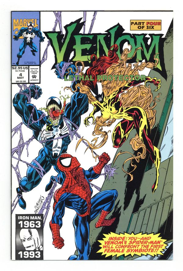 Tags: Marvel Legacy Numbering: Venom (part 4), Spider-Man$8.00Direct Edition. The first female symbiote enters the scene! Spider-Man and Venom confront the Life Foundation's master plan, when a new killer symbiote is born. Written by David Michelinie. Art by Ron Lim, Sam de la Rosa and Al Milgrom. Cover by Mark Bagley and Dan Panosian. Cover price $2.95.