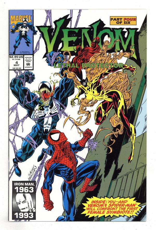 Tags: Marvel Legacy Numbering: Venom (part 4), Spider-Man$6.80Direct Edition. The first female symbiote enters the scene! Spider-Man and Venom confront the Life Foundation's master plan, when a new killer symbiote is born. Written by David Michelinie. Art by Ron Lim, Sam de la Rosa and Al Milgrom. Cover by Mark Bagley and Dan Panosian. Cover price $2.95.