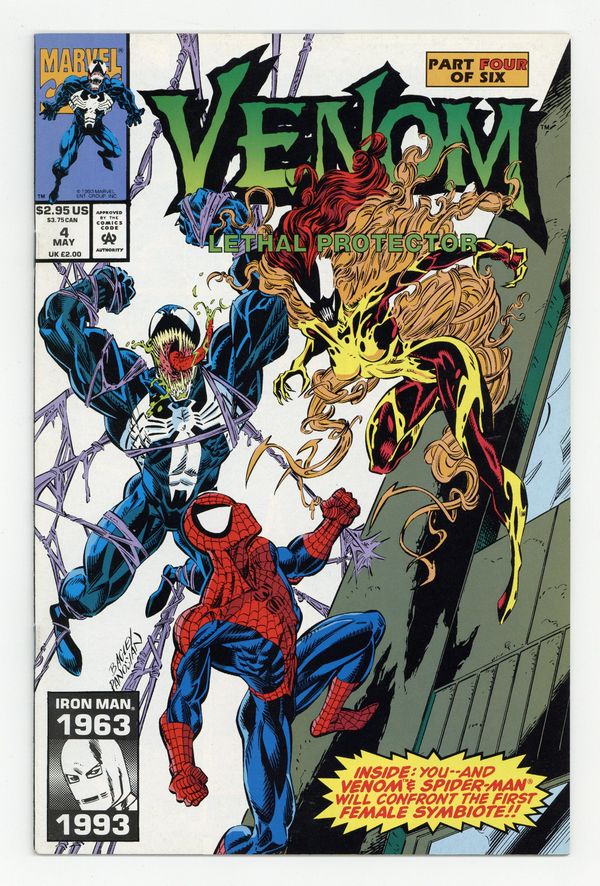 Tags: Marvel Legacy Numbering: Venom (part 4), Spider-Man$18.00Direct Edition. The first female symbiote enters the scene! Spider-Man and Venom confront the Life Foundation's master plan, when a new killer symbiote is born. Written by David Michelinie. Art by Ron Lim, Sam de la Rosa and Al Milgrom. Cover by Mark Bagley and Dan Panosian. Cover price $2.95.