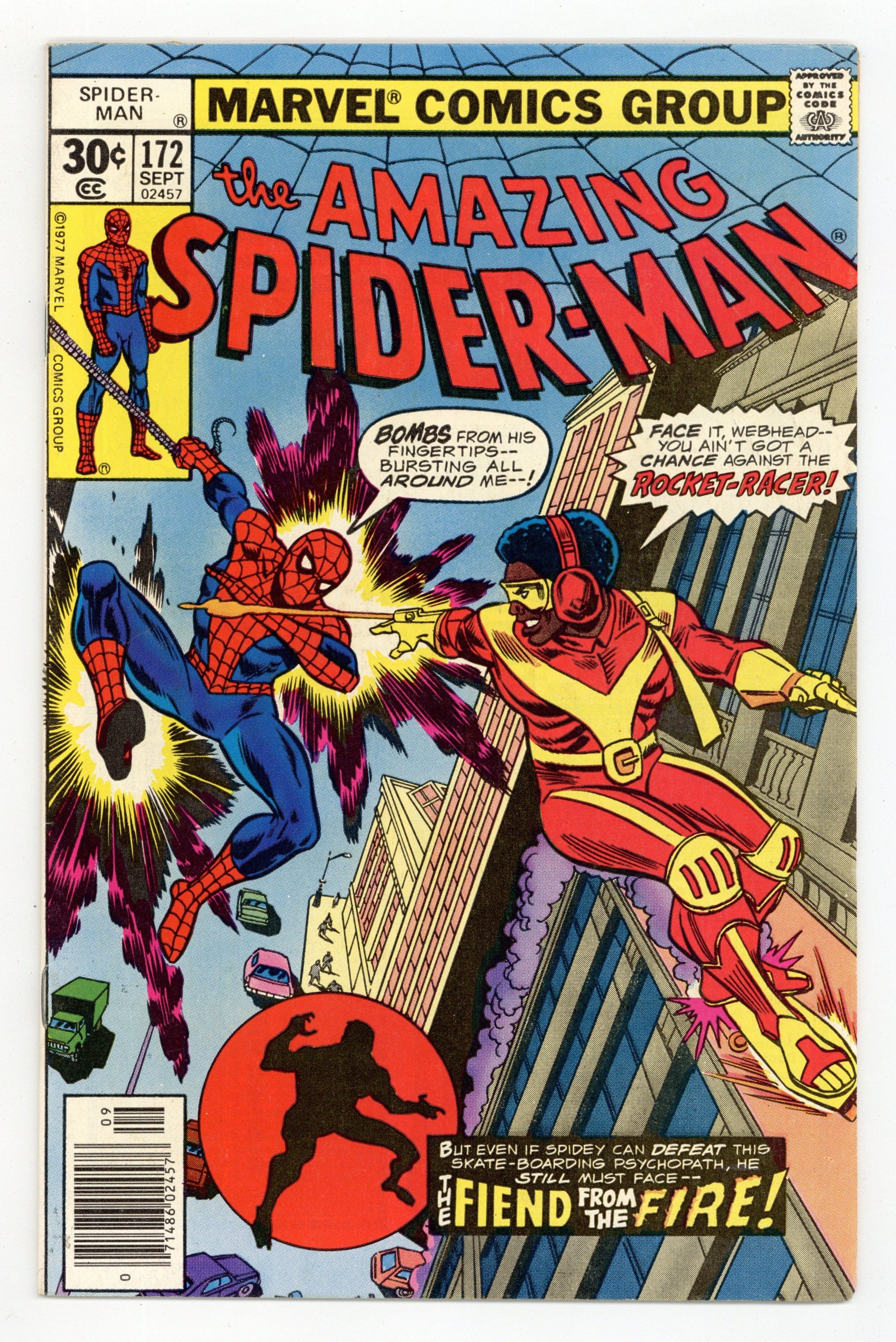 Tags: Marvel Legacy Numbering: Amazing Spider-Man (part 172), Spider-Man$17.00"The Fiend from the Fire!" Part 1 of 2. First appearance of the Rocket Racer. Script by Len Wein. Art by Ross Andru (breakdowns) and Frank Giacoia (finishes). Cover by Ross Andru and Frank Giacoia. The action begins with a bang as the web-slinger chases a new skateboarding super-villain! The Rocket Racer! This red and yellow robber is moving and grooving through the streets on his souped-up skateboard! But the Spectacular Spider-Man is waiting right around the corner to teach him a lesson in driver etiquette! Meanwhile the police arrest Liz Allan for stealing drugs and chemicals from a local hospital! Why would Liz do that? Maybe she did it for a man! Or perhaps more specifically the Molten Man! Cameo appearances by Harry Osborn, J. Jonah Jameson, and Dr. Marla Madison. (Notes: The Rocket Racer appears next in Amazing Spider-Man 182. The Molten Man previously battled the web-slinger in Amazing Spider-Man 133. A limited distribution 35-cent cover price variant exists for this issue. 36 pages Cover price $0.30.