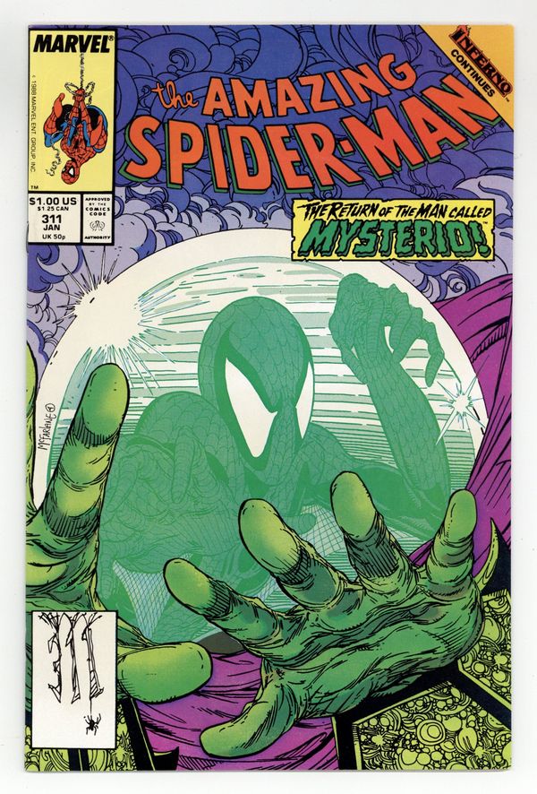 Tags: Inferno (part 9), Marvel Legacy Numbering: Amazing Spider-Man (part 311)$16.00Direct Edition. "Mysteries of the Dead" Inferno crossover. Script by David Michelinie. Art by Todd McFarlane. Cover by Todd McFarlane. Crazy things are happening in the Big Apple as a result of Inferno! When a brick building comes to life and crushes an innocent bystander, the wondrous wall-crawler is devastated that he couldn't save the poor man. However, the next day when he returns to the same location, the web-slinger senses a mystery. Or perhaps better stated...Mysterio! Under the cover of Inferno, the Master of Illusion attempts to wreak havoc on Spider-Man's life! Can the spectacular one see through the mist and fog and solve (the) Mysterio? Appearance by Mary Jane Watson. Cameo appearances by Dr. Curt Connors, Harry Osborn, Liz Osborn, Normie Osborn, and the Hobgoblin. (Notes: Elements of the story continue in Spectacular Spider-Man 146.) 36 pgs. Cover price $1.00.