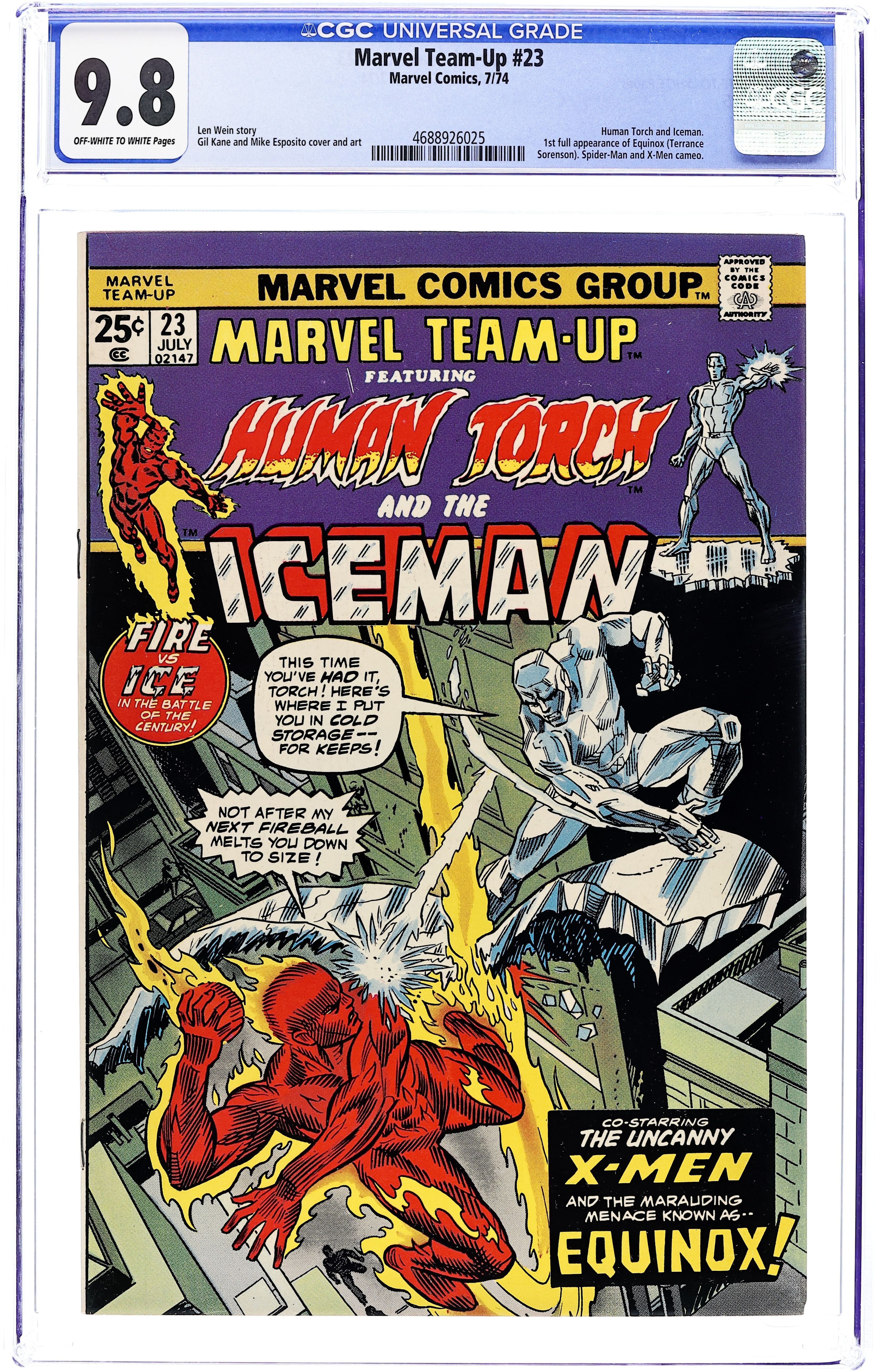 Tags: Fantastic Four, X-Men$11.00Script by Len Wein. Pencils by Gil Kane. Inks by Mike Esposito and Dave Hunt. Cover by Gil Kane and Frank Giacoia. The Human Torch and Iceman battle Equinox, the Thermodynamic Man, in "The Night of the Frozen Inferno." This story is a continuation from a subplot in Giant-Size Spider-Man #1. Cameo appearances by Spider-Man, Angel, Cyclops, and Marvel Girl. (Equinox returns to battle Spider-Man in Marvel Team-Up #59. Iceman appears next in Giant-Size X-Men #1. The letters page contains Marvel Value Stamp Series A #28, Hawkeye.) 36 pages. Cover price $0.25.