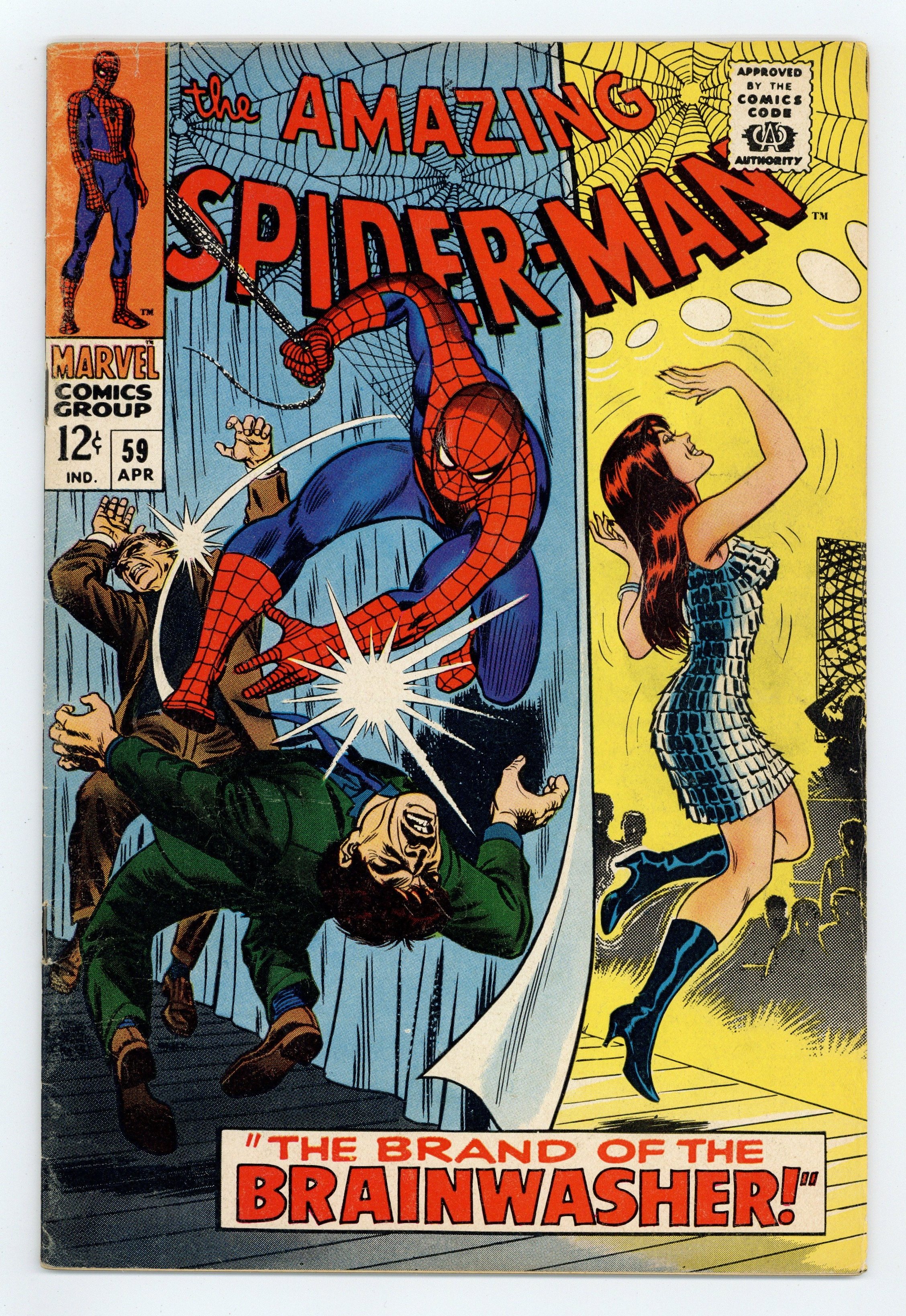 First cover appearance of Mary Jane Watson in "The Brand of the Brainwasher!" Part 1 of 3. Script by Stan Lee. Art by John Romita (layouts) and Don Heck (pencils). Inks by Mike Esposito (as Mickey Demeo). Classic cover by John Romita. Mary Jane has a new job as a go-go dancer at the Gloom Room nightclub! And for MJ's opening night many of her friendsand city officials -- including Captain George Stacy -- attend the show. Interestingly, Mary Jane has a second task for the evening: take pictures of the club's guests with a special camera. After MJ snaps a photo of Gwen's father, he begins acting strangely and then disappears! Who is the owner of this nightclub by the way? Peter suspects that something is amiss, so he quickly changes clothes and swings into action! The night began with Peter Parker on a date with Gwen Stacy...and ends with the Amazing Spider-Manrescuing Mary Jane Watson! A fun issue! Cameo appearances by Aunt May, Harry Osborn, and the Kingpin. (Notes: This story was reprinted in Marvel Tales #42. This issue includes a statement of ownership: average print run: 587,213; average paid circulation 361,663.) 36 pages. Cover price $0.12.