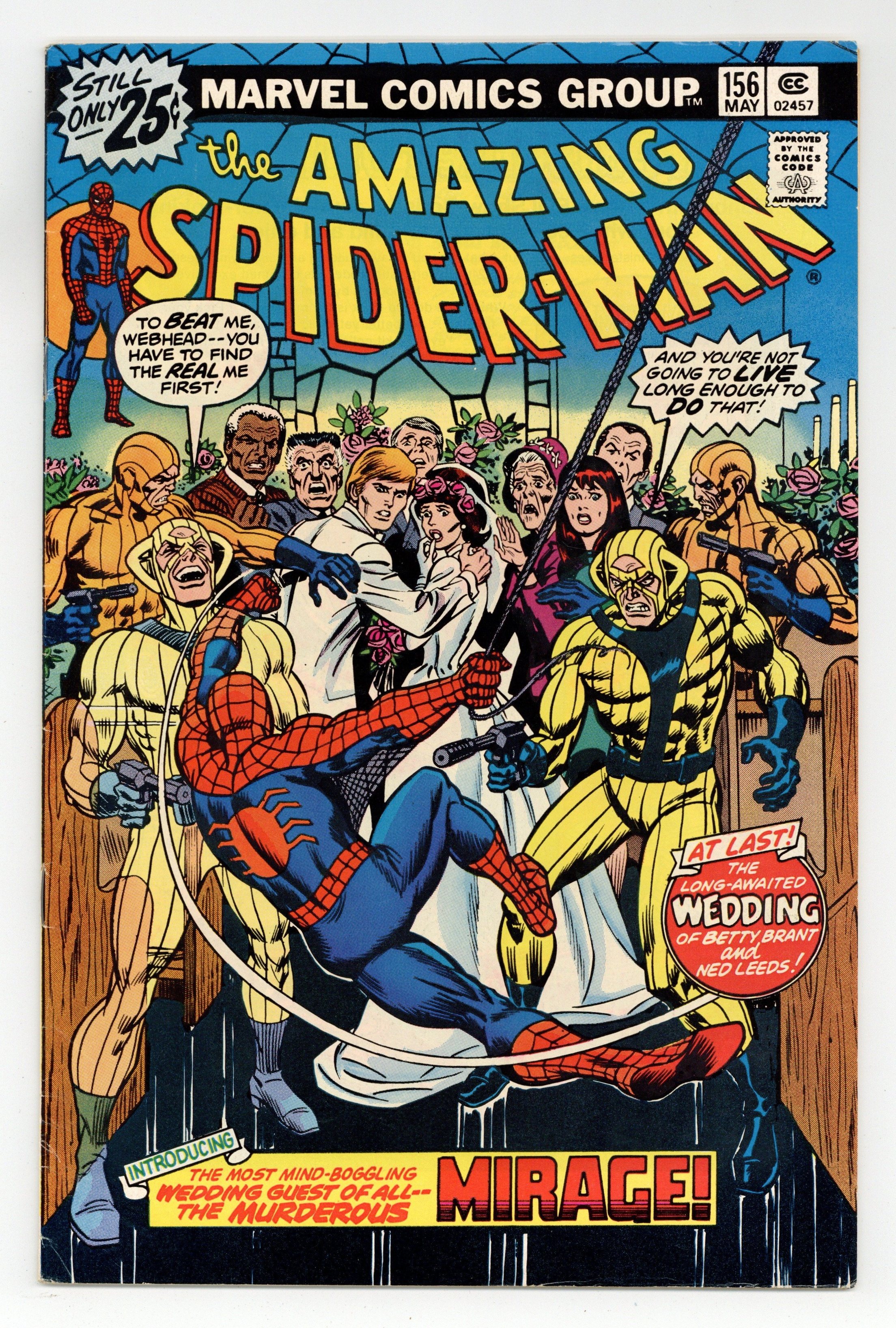 Tags: Marvel Legacy Numbering: Amazing Spider-Man (part 156), Spider-Man$27.00"On a Clear Day, You Can See...The Mirage!" Script by Len Wein. Pencils by Ross Andru. Inks by Mike Esposito and Dave Hunt (backgrounds). Cover by John Romita. Wedding bells ring in the pages of the Amazing Spider-Man! As Peter's former girlfriend (Betty Brant) and the web-slinger's future foe (Ned Leeds aka the Hobgoblin) tie the knot! The joyous ceremony proceeds as planned until a wedding crasher shows up! The Mirage! And he's not just looking for free hors d'oeuvres! Can the wall-crawler see through the Mirage and restore Betty and Ned's happy day? First Appearance of the Mirage. Appearances by Aunt May, Anna Watson, Mary Jane Watson, Flash Thompson, Harry Osborn, Liz Allan, J. Jonah Jameson, Joe Robertson, and Doctor Octopus. (Notes: The Mirage appears next in Marvel Two-in-One 96. The letters page includes Marvel Value Stamp series B #83 the Incredible Hulk. This story was reprinted in Marvel Tales 133. A 30-cent cover price variant exists for this issue.) 36 pages. Cover price $0.25.
