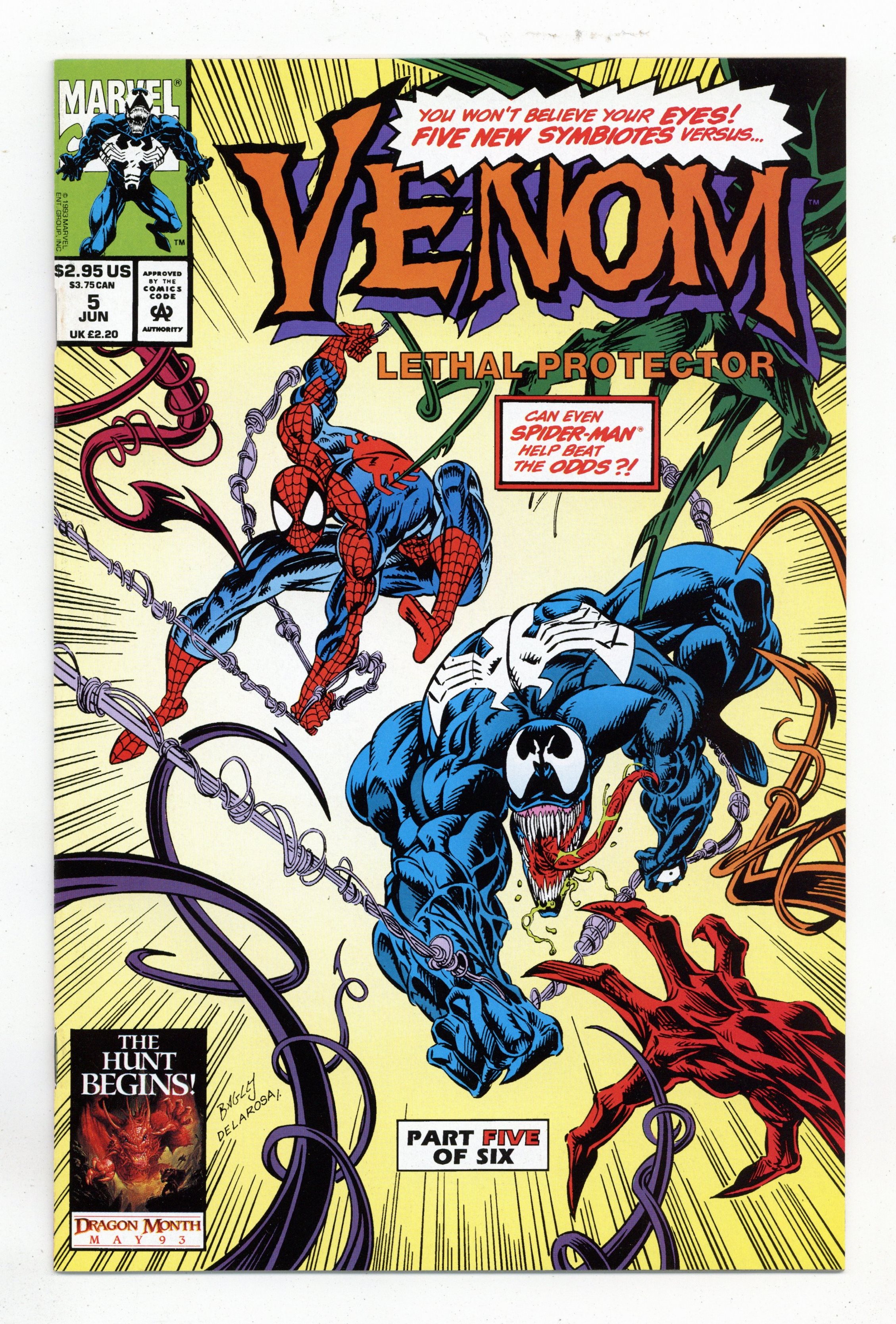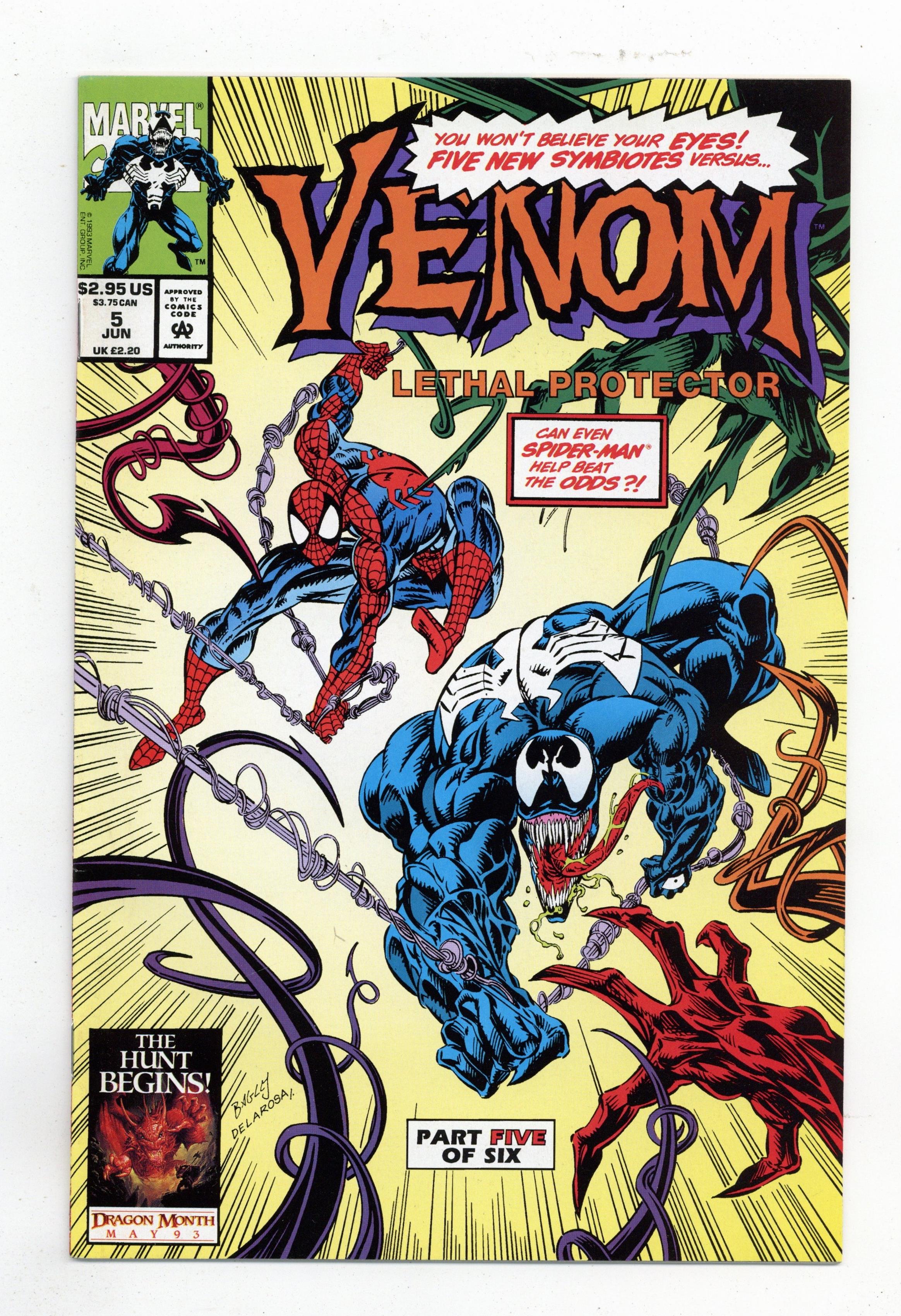 Tags: Marvel Legacy Numbering: Venom (part 5), Spider-Man$12.00Direct Edition. Written by David Michelinie. Art by Ron Lim and Sam de la Rosa. Cover by Mark Bagley and Sam de la Rosa. When Venom spawns five new killer symbiotes, Spider-Man teams up with him to blast them! Cover price $2.95.