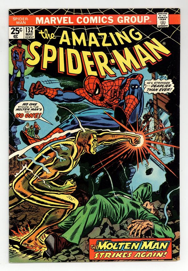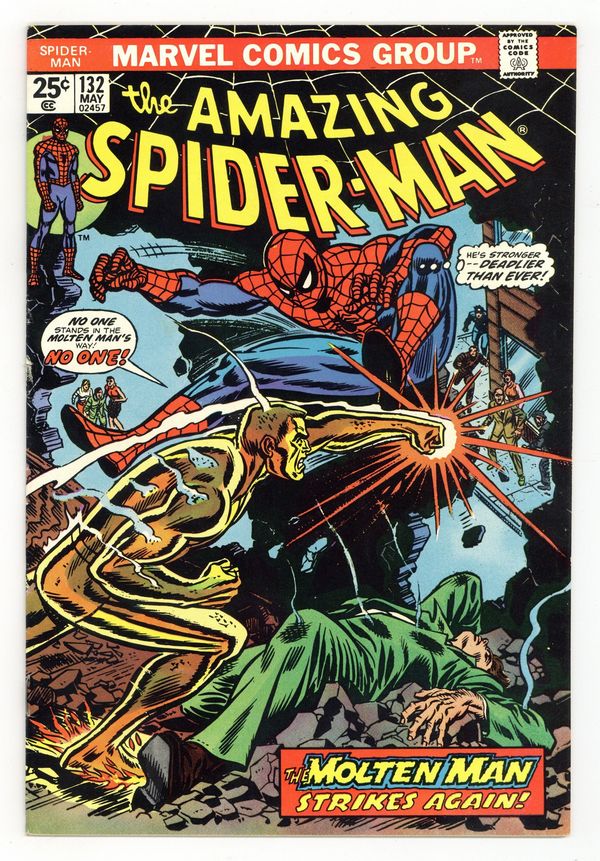 Tags: Marvel Legacy Numbering: Amazing Spider-Man (part 132), Spider-Man$33.00"The Master Plan of the Molten Man!" Part 1 of 2. Script by Gerry Conway. Pencils by John Romita and Paul Reinman. Inks by Paul Reinman, Tony Mortellaro (backgrounds), and John Romita (alterations). Cover by Gil Kane and John Romita. On the Upper East Side, Peter Parker bumps into an old acquaintance: Liz Allan. Whoa, where has she been since high school (and Amazing Spider-Man #30)? A few hours later inside a run-down tenement, the web-slinger bumps into an old enemy: the Molten Man! Where has he been since Amazing Spider-Man #35? Is it possible that both their returns are somehow connected? Ned Leeds and Mary Jane Watson will work to answer that question, while the wall-crawler tries to stay cool against his fiery foe! Cameo appearances by Betty Brant and Joe Robertson. First 25¢ cover. (Notes: This issue includes an ad for Marvel's new Deadly Hands of Kung Fu (1974) magazine. The letters page contains Marvel Value Stamp series A #6 Thor by John Buscema and Mike Esposito. The letters page also includes a statement of ownership: average print run 541,043; average paid circulation 273,204. This issue was reprinted in Marvel Tales 109.) 32 pages. Cover price $0.25.