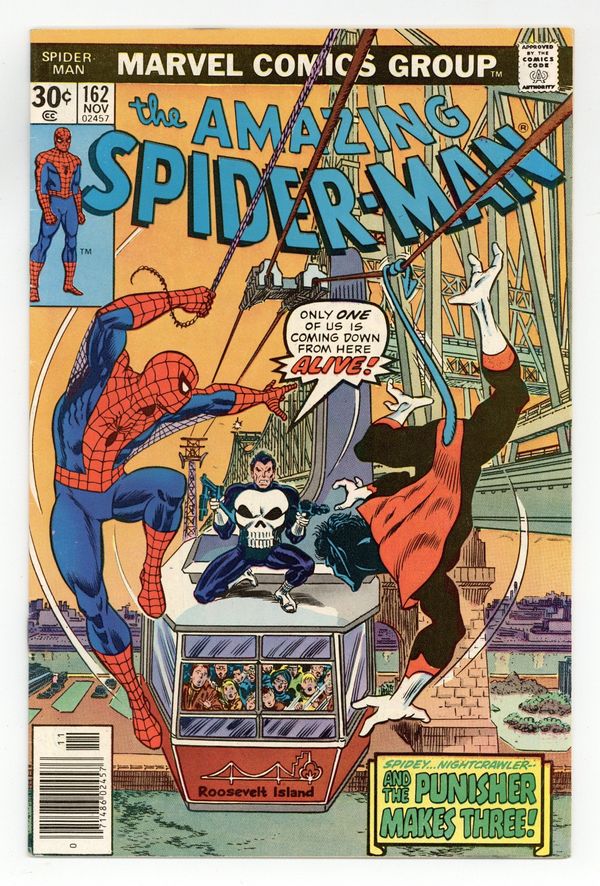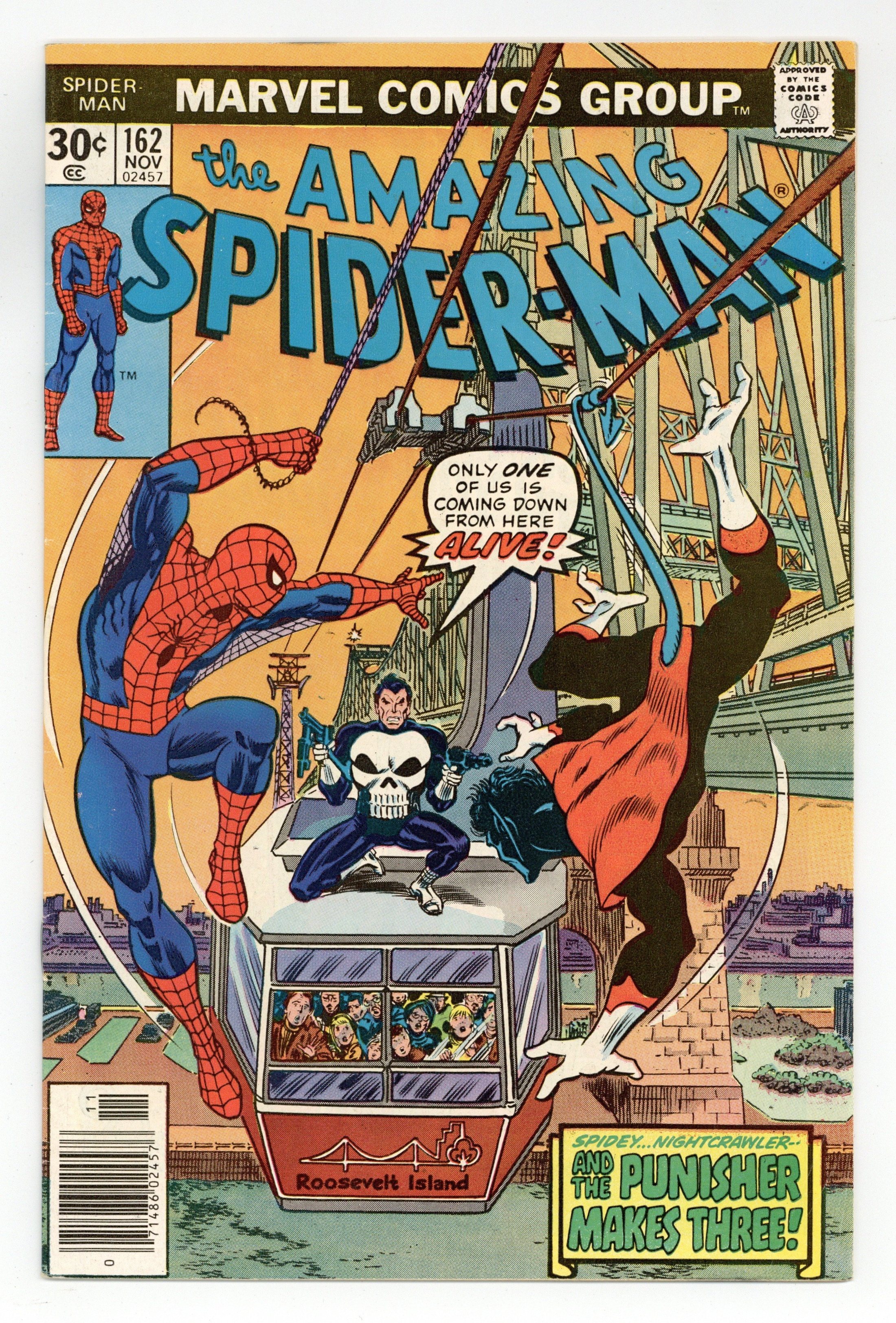 "Let the Punisher Fit the Crime!" Part 2 of 2. Guest-starring Nightcrawler and the Punisher. Script by Len Wein. Art by Ross Andru (breakdowns), Mike Esposito (finishes), and Dave Hunt (backgrounds). Cover by Ross Andru and John Romita. After a scuffle atop the Roosevelt Tramway; the Punisher, Nightcrawler, and Spider-Man come to a meeting of the minds! The trio realizes that none of them are the lethal sniper terrorizing the city! And they vow to catch the mysterious gunman before his next kill! Acting on a tip; the web-slinger, Punisher, and Nightcrawler converge on a street festival to smoke out the shooter! Can the heroes solve the killer's deadly puzzle? Or perhaps better stated...his Jigsaw puzzle? First appearances of Dr. Marla Madison and Jigsaw. Cameo appearances by Harry Osborn, Flash Thompson, Mary Jane Watson, and J. Jonah Jameson. (Notes: The Punisher appears next in Amazing Spider-Man 174. Jigsaw returns in Amazing Spider-Man 188. This story was reprinted in Marvel Tales 215.) 36 pages. Cover price $0.30.