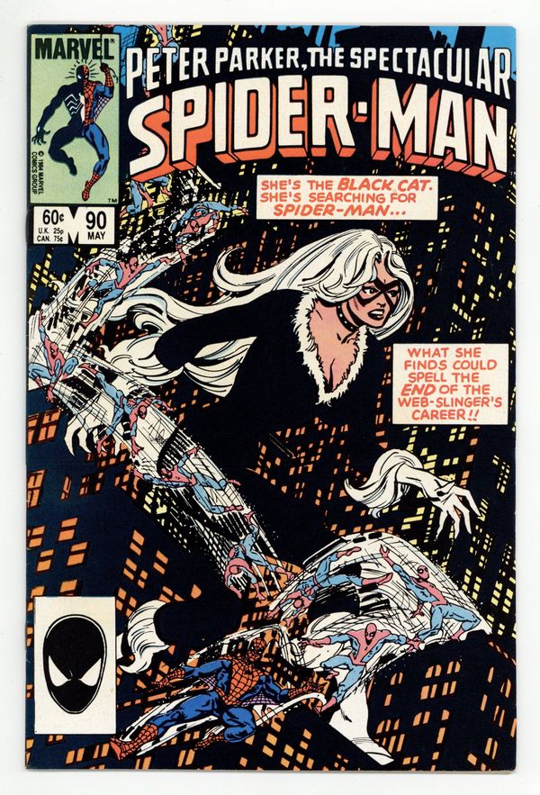 Tags: Chronological Appearances of Spider-Man's Black Costume (part 11 (2nd app. after Official Debut)), Marvel Legacy Numbering: Spectacular Spider-Man (part 90), Print Run Statistics, Secret Wars (1984) (part Aftermath 07), Black Cat, Spider-ManSpectacular Spider-Man (1976 1st Series) 90D FN/VF 7.0