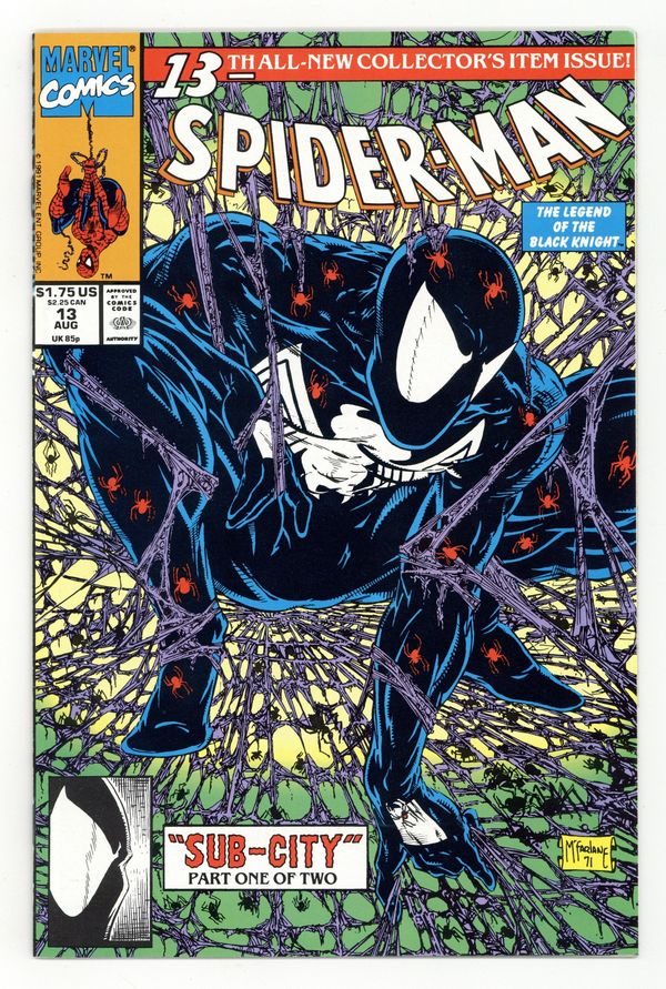 Direct Edition. Sub-City Part 1 of 2. Script and art by Todd McFarlane. Cover by Todd McFarlane. In Midtown Manhattan homeless people are disappearing off the streets. And a Daily Bugle reporter suspects foul play! The wall-crawler decides to stake out the area...and wait for something or someone suspicious to show up. And sure enough...a strange creature does -- right out of the sewer system! Spider-Man wants to follow into the sewers to investigate further, but he needs to wear his old black costume for camouflage. However that's a major nonstarter for Mary Jane...since she hates Spidey's black costume! What is a married web-slinger to do? Cameo appearances by J. Jonah Jameson and Morbius. (Note: The cover is an homage to Spider-Man (1990) issue #1.) 32 pages. Cover price $1.75.