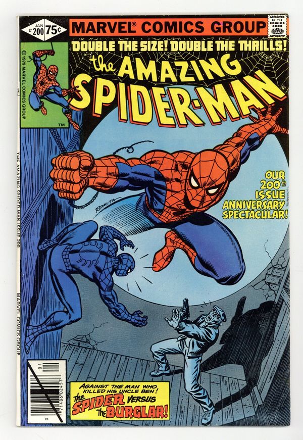 Tags: Giant-Sized Issue, Marvel Legacy Numbering: Amazing Spider-Man (part 200)$25.50Direct Edition. "The Spider and the Burglar...A Sequel" Script by Marv Wolfman. Art by Keith Pollard (breakdowns) and Jim Mooney (finishes). Cover by John Romita. It's the bicentennial issue of the Amazing Spider-Man! And the web-slinger is going back, all the way back, to the days of Amazing Fantasy 15 to once again confront the criminal that murdered his Uncle Ben! But this time Peter Parker will have to stop the killer without his spider powers! Given a second chance, can the wall-crawler right the wrongs from the past and save his beloved Aunt May? Emotions run at an all-time high for your friendly neighborhood Spider-Man! Brief retelling of Spider-Man's origin. Cameo appearance by Anna Watson. Final appearance of the burglar. Flashback cameo by Ben Parker. (Note: Stan Lee scripts the final page of the story.)52 pgs. Cover price $0.75.