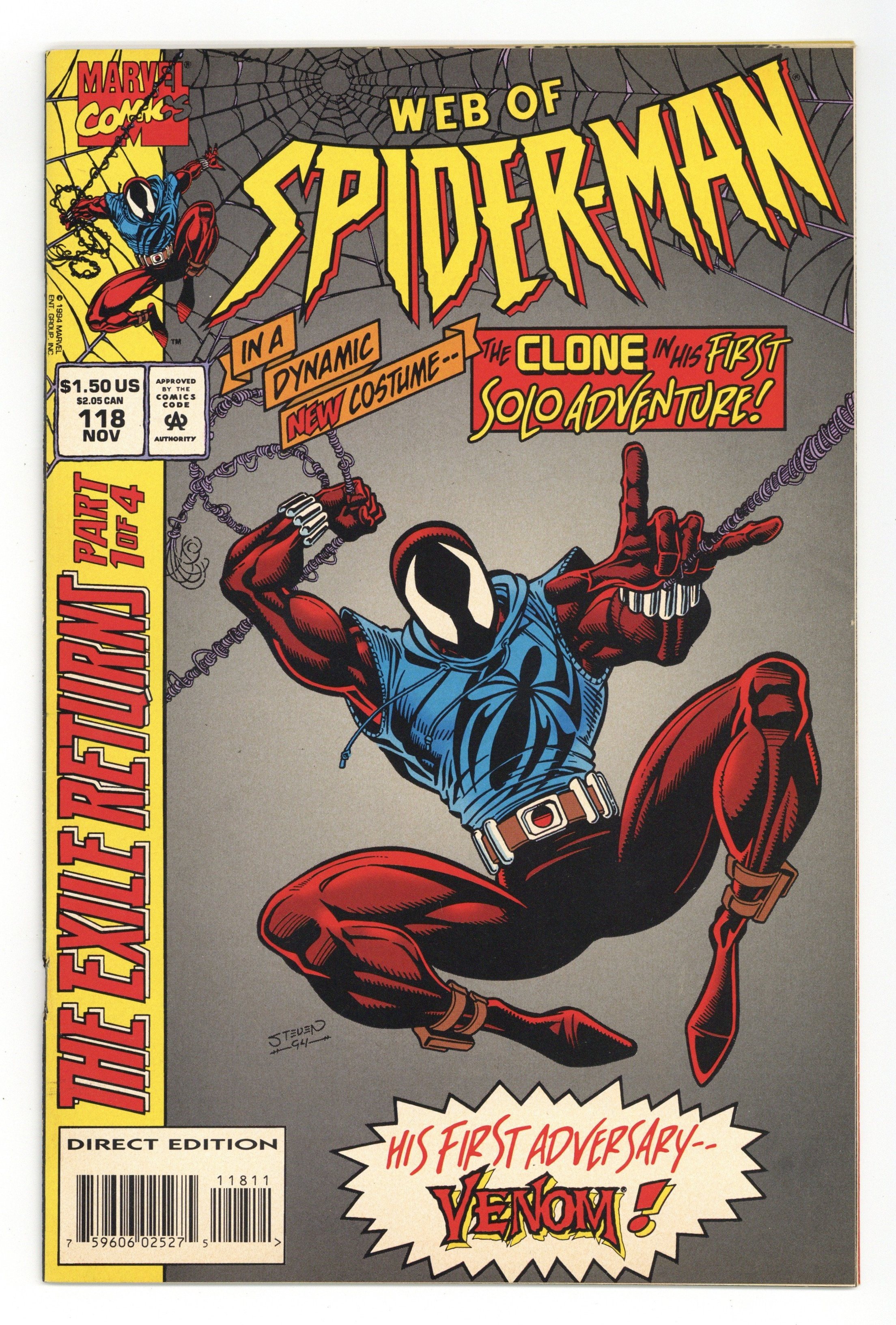 First Printing. Direct Edition. First appearance of the Scarlet Spider (aka Ben Reilly) in The Exile Returns Part 1 of 4. "Memories" Guest-starring Venom. Script by Terry Kavanagh. Art by Steven Butler (breakdowns) and Randy Emberlin (finishes). Cover by Steven Butler. Plot continues from Spectacular Spider-Man 217. Ben Reilly (aka the Spider-Clone) wanders around Manhattan trying to bury the memories of his (and Peter Parker's) past. However Ben knows that with great power comes great responsibility. So he crafts a different -- yet similar -- superhero identity to fight crime. Meanwhile, Venom is back in town and wreaking havoc on the Upper East Side. But the Scarlet Spider vows to stop him! Story continues in Spider-Man (1990) #52. Cameo appearances by Aunt May, Anna Watson, Betty Brant, and Ken Ellis. 32 pages. Cover price $1.50.