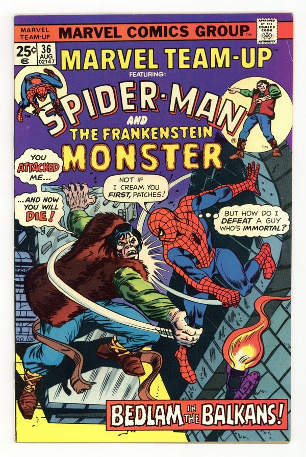 Tags: Spider-Man$26.00"Once Upon a Time, in a Castle" Part 1 of 2. Guest-starring Spider-Man and the Frankenstein Monster. Script by Gerry Conway. Art by Sal Buscema (layouts) and Vince Colletta (finishes). Cover by Ed Hannigan and Mike Esposito. At some point in high school, Peter Parker probably read Mary Shelley's classic novel "Frankenstein." At no point though did Peter think he might someday team up with Victor Frankenstein's creation! But due to a strange series of events, the Amazing Spider-Man finds himself across the Atlantic Ocean, in the Balkans, and inside the castle of the evil Baron von Shtupf...with only one friend by his side: the Frankenstein monster! It's a literary team up for the ages as the wondrous wall-crawler and the man-monster from the pages of a 19th century novel join forces...to save the world! Cameo appearance by the Man-Wolf. (Notes: Frankenstein previously appeared in Frankenstein Monster 18. This issue includes a 2-page retelling of the origin of Frankenstein's monster.) 36 pages. Cover price $0.25.