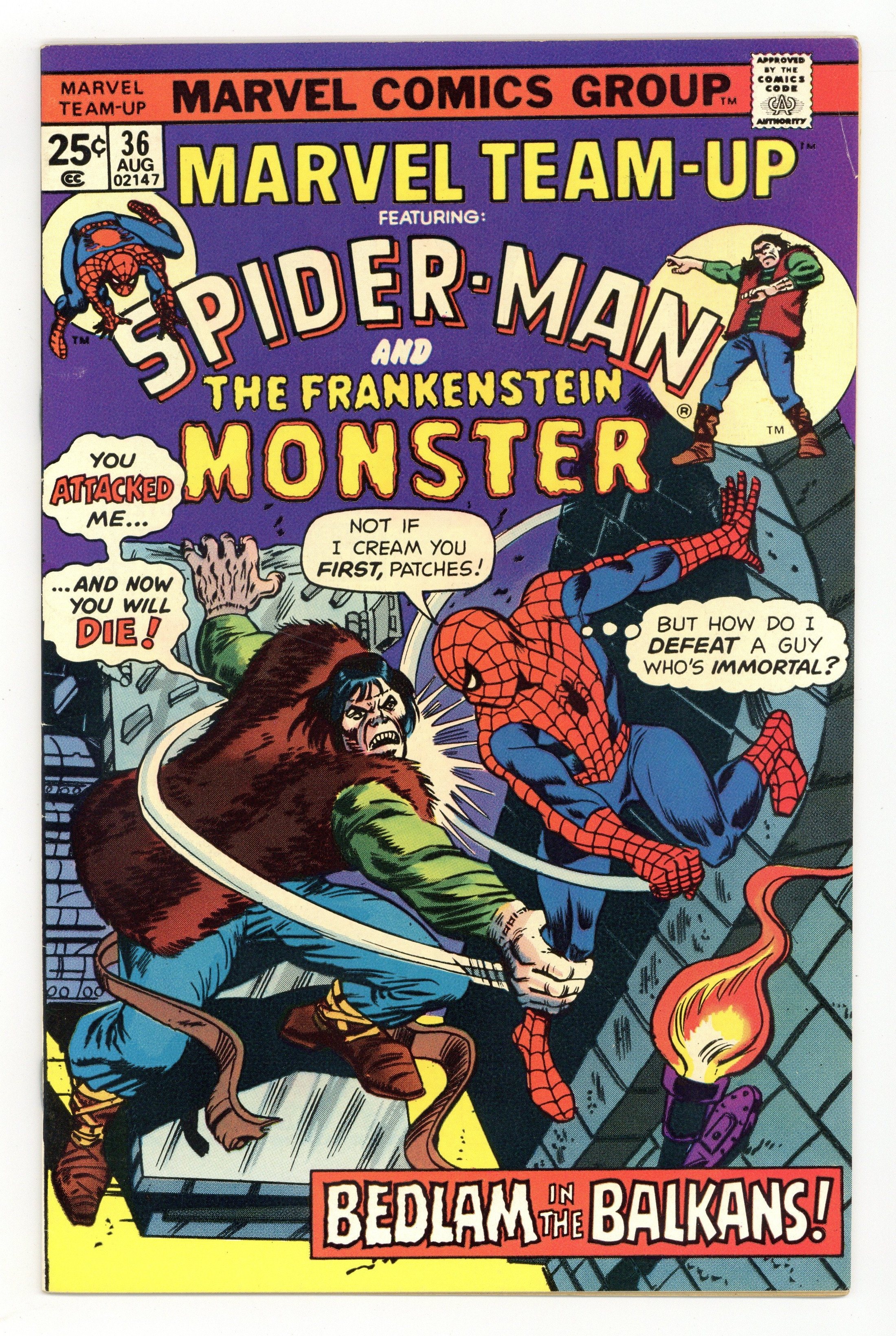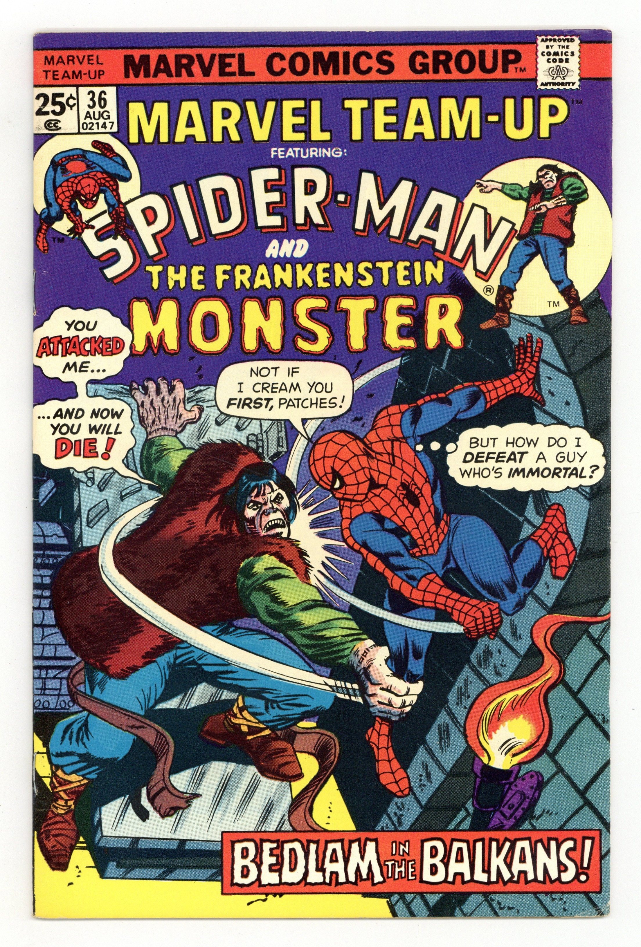 "Once Upon a Time, in a Castle" Part 1 of 2. Guest-starring Spider-Man and the Frankenstein Monster. Script by Gerry Conway. Art by Sal Buscema (layouts) and Vince Colletta (finishes). Cover by Ed Hannigan and Mike Esposito. At some point in high school, Peter Parker probably read Mary Shelley's classic novel "Frankenstein." At no point though did Peter think he might someday team up with Victor Frankenstein's creation! But due to a strange series of events, the Amazing Spider-Man finds himself across the Atlantic Ocean, in the Balkans, and inside the castle of the evil Baron von Shtupf...with only one friend by his side: the Frankenstein monster! It's a literary team up for the ages as the wondrous wall-crawler and the man-monster from the pages of a 19th century novel join forces...to save the world! Cameo appearance by the Man-Wolf. (Notes: Frankenstein previously appeared in Frankenstein Monster 18. This issue includes a 2-page retelling of the origin of Frankenstein's monster.) 36 pages. Cover price $0.25.