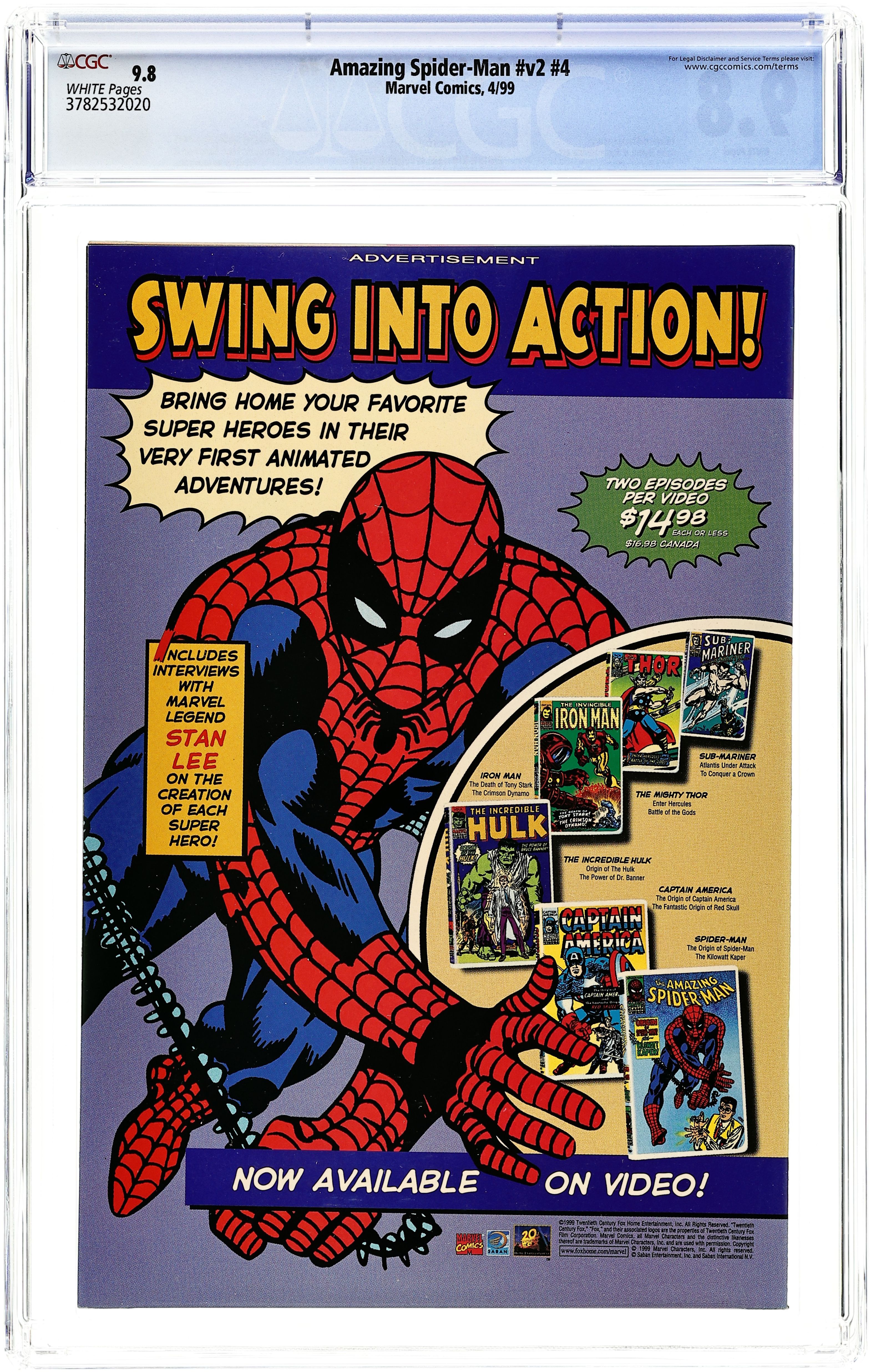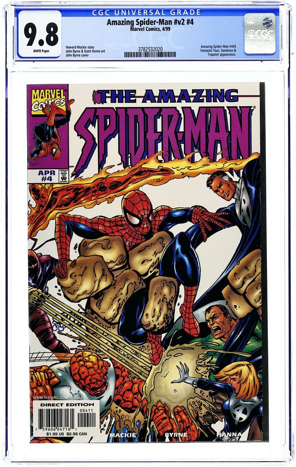 Cover by John Byrne. "Betrayals," script by Howard Mackie, pencils by John Byrne, inks by Scott Hanna; Spider-Man and the Fantastic Four are in the middle of a fight with half of the Frightful Four, The Sandman and The Trapster; Spider-Man decides to go back to the beginning of the story where he has visited the Fantastic Four to find out whether he is a clone or the real Spider-Man; There the Thing tells Spidey that they have constant camera surveillance on the Sandman when the story switches to the Sandman and Senator Ward sneaking around in a dark Hotel Lobby; Thanks to a phonecall to Mary Jane, Spidey travels to the same hotel to comfort Jill Stacy who is afraid of the dark when he spots the Trapster; Meanwhile the Trapster has been paid to make an assassination attempt on Senator Ward with the help of the Sandman, and soon Spidey arrives with the Fantastic Four not far behind; Spidey and the Fantastic Four fight the Trapster. 38 pgs., full color. $1.99. Cover price $1.99.