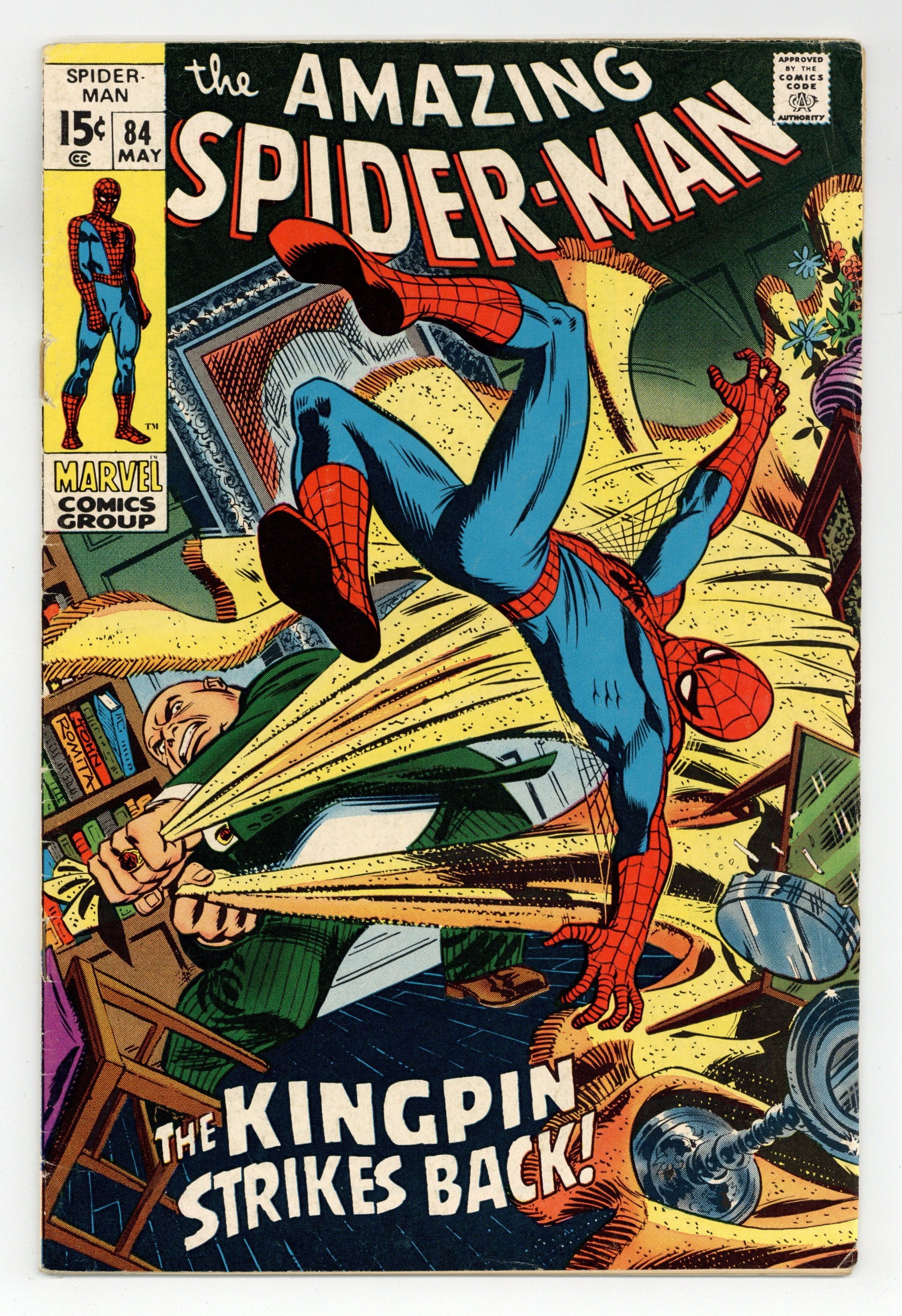 Tags: Marvel Legacy Numbering: Amazing Spider-Man (part 84), Spider-Man$37.50"The Kingpin Strikes Back!" Part 2 of 3. Script by Stan Lee. Art by John Romita (layouts), John Buscema (pencils), and Jim Mooney (inks). Cover by John Romita. The Kingpin has grown tired of sitting on the sidelines. So he prepares to strike back against the Schemer! But the Schemer beats the big crime boss to the punch and invades Wilson Fisk's palatial manor! Once inside he confronts the Kingpin...and then he sees Vanessa Fisk -- the Kingpin's wife! The tension in the room could be cut with a knife...until the web-slinger crashes thru the window! And as shown on the brilliant cover, the wall-crawler and the Kingpin wage war in the mansion...while the Schemer deftly slips away. Both Spider-Man and the Kingpin will be left empty-handed on this night. Cameo appearances by Captain Stacy and Gwen Stacy. (Note: This story was reprinted in Marvel Tales #65.) 36 pages. Cover price $0.15.